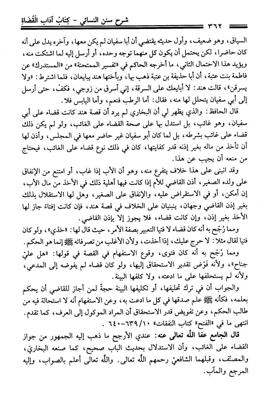 قَالَ الجامع عفا الله تعالى عنه: عندي الأرجح ما ذهب إليه الجمهور منْ جواز القضاء عَلَى الغائب، وأن الاستدلال بحديث الباب صحيح، كما صنعه البخاريّ، والمصنّف، وقبلهما الشافعيّ رحمهم الله تعالى. والله تعالى أعلم بالصواب، وإليه المرجع والمآب.
