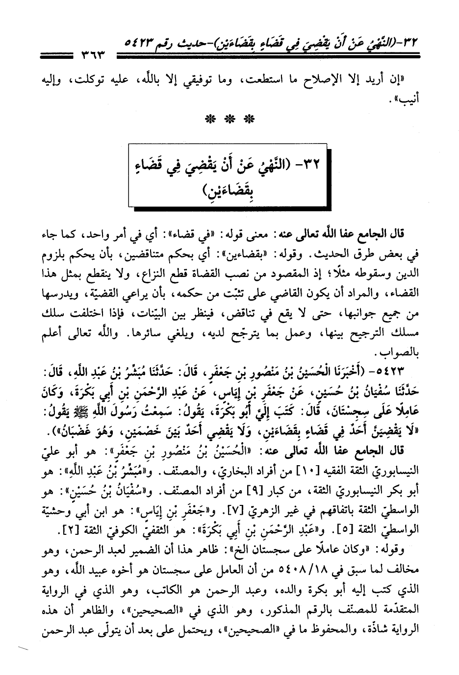 5423 - (أَخْبَرَنَا الْحُسَيْنُ بْنُ مَنْصُورِ بْنِ جَعْفَرٍ، قَالَ: حَدَّثَنَا مُبَشِّرُ بْنُ عَبْدِ اللَّهِ، قَالَ: حَدَّثَنَا سُفْيَانُ بْنُ حُسَيْنٍ، عَنْ جَعْفَرِ بْنِ إِيَاسٍ، عَنْ عَبْدِ الرَّحْمَنِ بْنِ أَبِي بَكْرَةَ، وَكَانَ عَامِلاً عَلَى سِجِسْتَانَ، قَالَ: كَتَبَ إِلَيَّ أَبُو بَكْرَةَ، يَقُولُ: سَمِعْتُ رَسُولَ اللَّهِ -صلى الله عليه وسلم- يَقُولُ: "لاَ يَقْضِيَنَّ أَحَدٌ فِي قَضَاءٍ بِقَضَاءَيْنِ، وَلاَ يَقْضِي أَحَدٌ بَيْنَ خَصْمَيْنِ، وَهُوَ غَضْبَانُ").