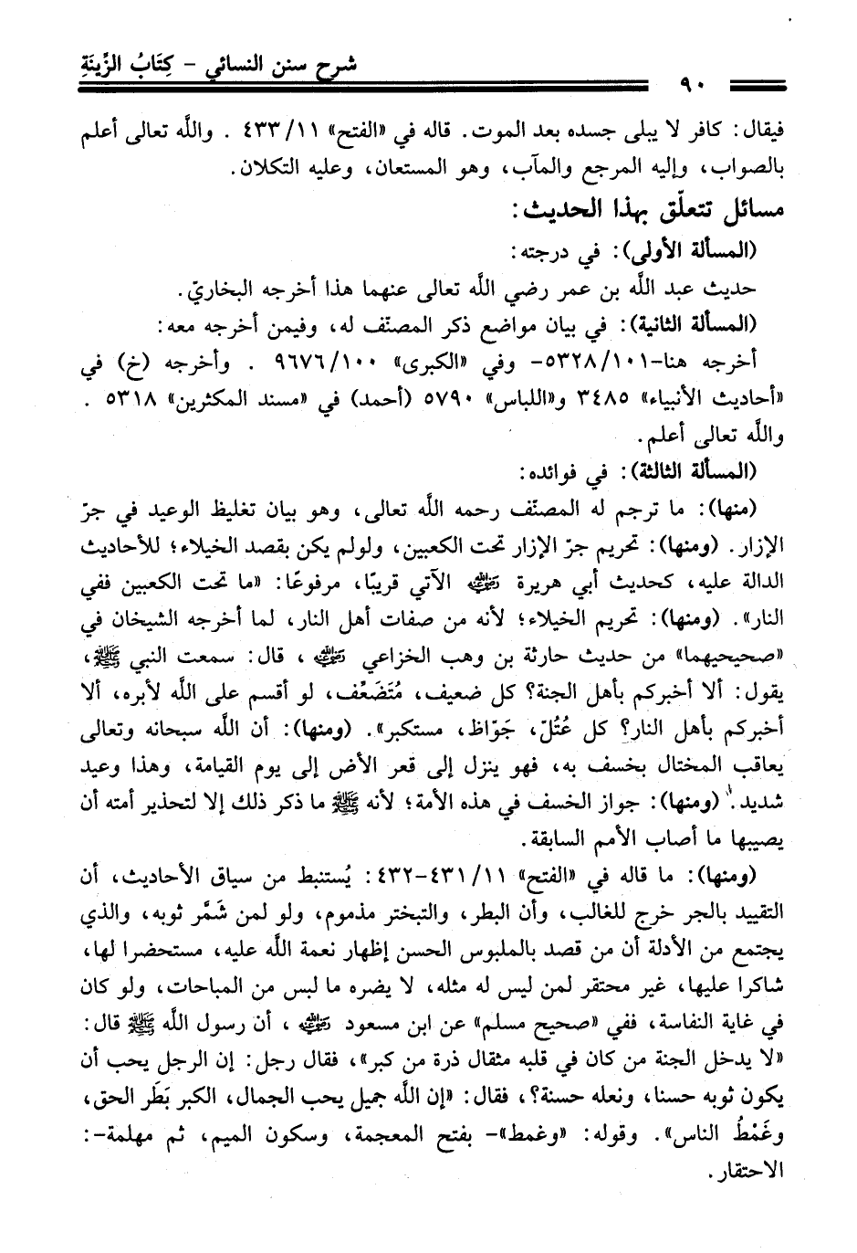 (ومنها): ما قاله فِي "الفتح" 11/ 431 - 432: يُستنبط منْ سياق الأحاديث، أن التقييد بالجر خرج للغالب، وأن البطر، والتبختر مذموم، ولو لمن شَمَّر ثوبه، والذي يجتمع منْ الأدلة أن منْ قصد بالملبوس الحسن إظهار نعمة الله عليه، مستحضرا لها، شاكرا عليها، غير محتقر لمن ليس له مثله، لا يضره ما لبس منْ المباحات، ولو كَانَ فِي غاية النفاسة، ففي "صحيح مسلم" عن ابن مسعود -رضي الله عنه-، أن رسول الله -صلى الله عليه وسلم- قَالَ: "لا يدخل الجنة منْ كَانَ فِي قلبه مثقال ذرة منْ كبر"، فَقَالَ رجل: إن الرجل يحب أن يكون ثوبه حسنا، ونعله حسنة؟، فَقَالَ: "إن الله جميل يحب الجمال، الكبر بَطَر الحق، وغَمْطُ النَّاس". وقوله: "وغمط" -بفتح المعجمة، وسكون الميم، ثم مهلمة-: الاحتقار.