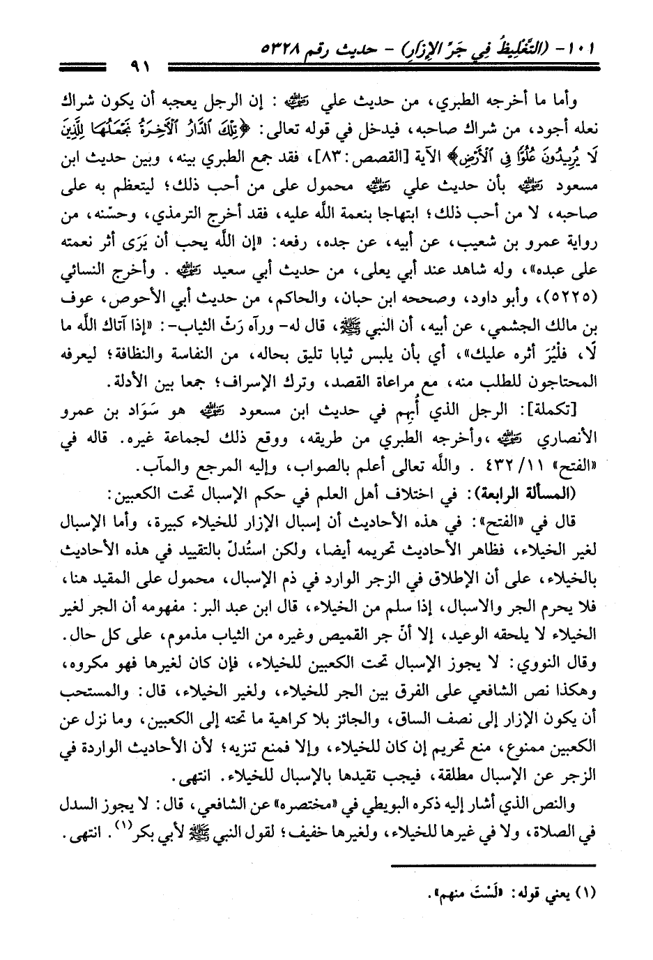 قَالَ فِي "الفتح": فِي هذه الأحاديث أن إسبال الإزار للخيلاء كبيرة، وأما الإسبال لغير الخيلاء، فظاهر الأحاديث تحريمه أيضًا، ولكن استُدلّ بالتقييد فِي هذه الأحاديث بالخيلاء، عَلَى أن الإطلاق فِي الزجر الوارد فِي ذم الإسبال، محمول عَلَى المقيد هنا، فلا يحرم الجر والاسبال، إذا سلم منْ الخيلاء، قَالَ ابن عبد البرّ: مفهومه أن الجر لغير الخيلاء لا يلحقه الوعيد، إلا أنّ جر القميص وغيره منْ الثياب مذموم، عَلَى كل حال. وَقَالَ النوويّ: لا يجوز الإسبال تحت الكعبين للخيلاء، فإن كَانَ لغيرها فهو مكروه، وهكذا نص الشافعيّ عَلَى الفرق بين الجر للخيلاء، ولغير الخيلاء، قَالَ: والمستحب أن يكون الإازار إلى نصف الساق، والجائز بلا كراهية ما تحته إلى الكعبين، وما نزل عن الكعبين ممنوع، منع تحريم إن كَانَ للخيلاء، وإلا فمنع تنزيه؛ لأن الأحاديث الواردة فِي الزجر عن الإسبال مطلقة، فيجب تقيدها بالإسبال للخيلاء. انتهى.