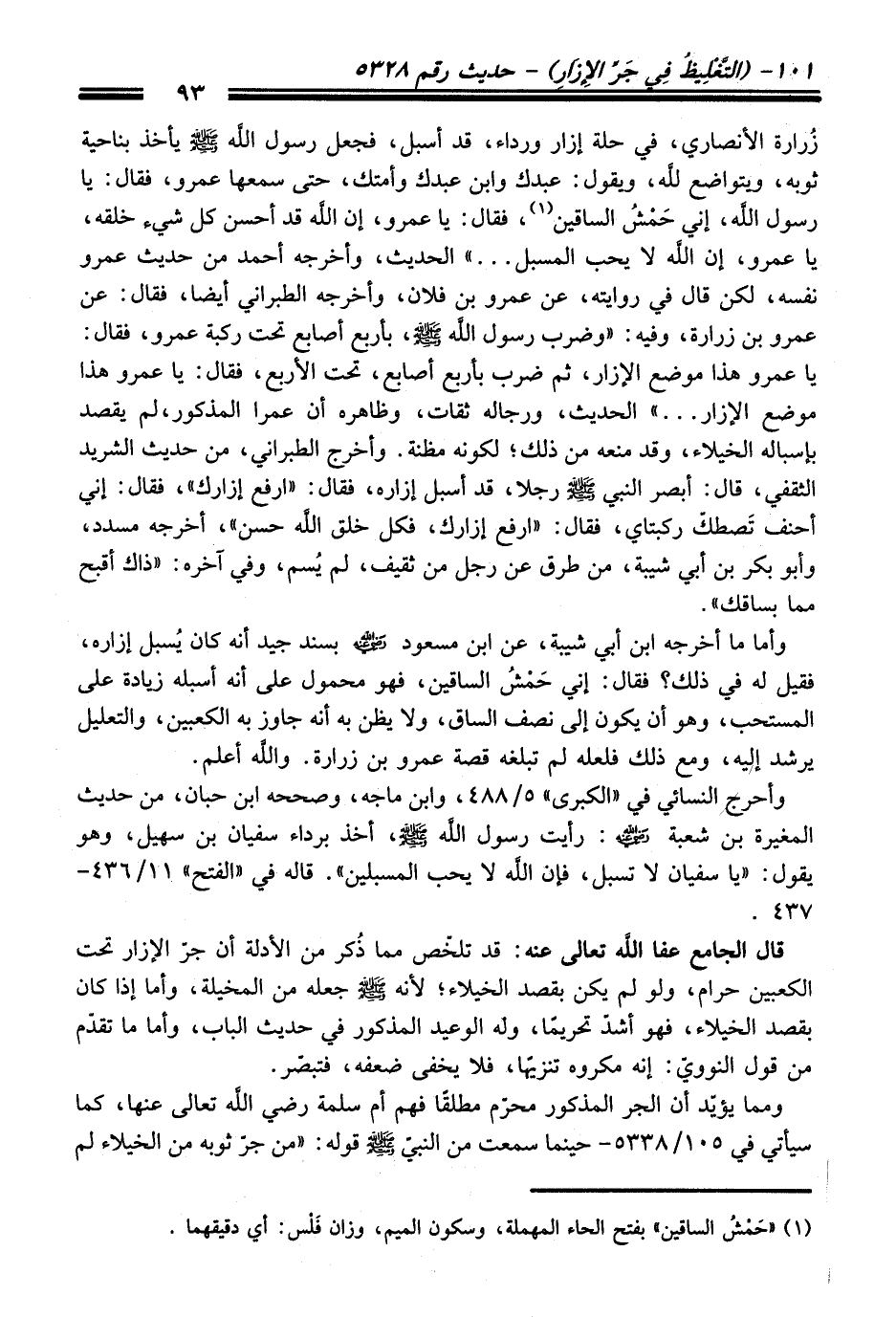 قَالَ الجامع عفا الله تعالى عنه: قد تلخّص مما ذُكر منْ الأدلة أن جرّ الإزار تحت الكعبين حرام، ولو لم يكن بقصد الخيلاء؛ لأنه -صلى الله عليه وسلم- جعله منْ المخيلة، وأما إذا كَانَ بقصد الخيلاء، فهو أشدّ تحريماً، وله الوعيد المذكور فِي حديث الباب، وأما ما تقدّم منْ قول النوويّ: إنه مكروه تنزيهًا، فلا يخفى ضعفه، فتبصّر.