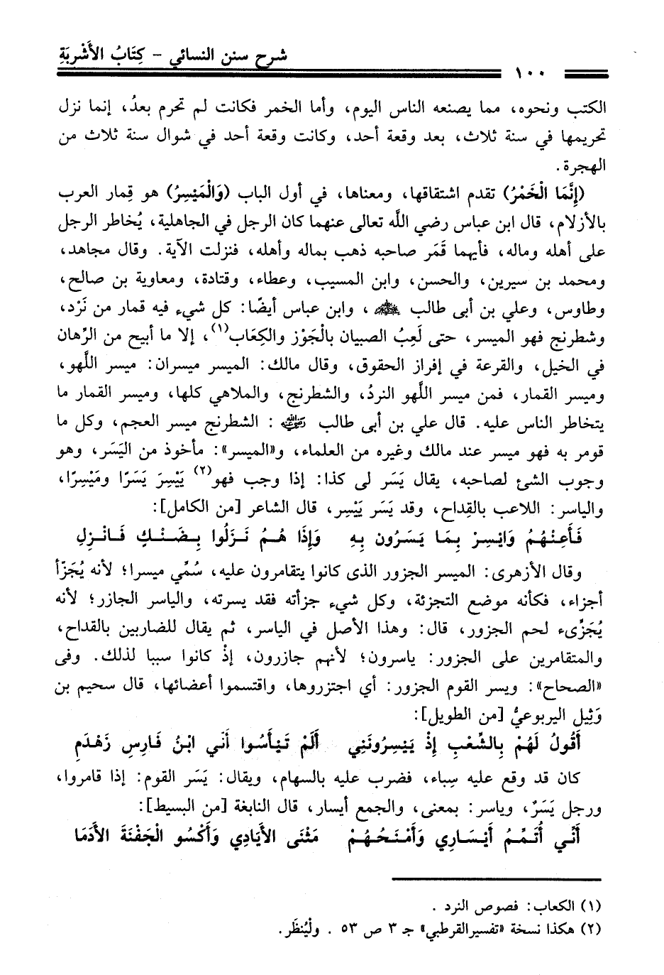 {إِنَّمَا الْخَمْرُ} تقدّم اشتقاقها، ومعناها , فِي أول الباب {وَالْمَيْسِرُ} هو قِمار العرب بالأزلام، قَالَ ابن عبّاس رضي الله تعالى عنهما كَانَ الرجل فِي الجاهلية، يُخاطر الرجل عَلَى أهله وماله، فأيهما قَمَر صاحبه ذهب بماله وأهله، فنزلت الآية. وَقَالَ مجاهد، ومحمد بن سيرين، والحسن، وابن المسيب، وعطاء، وقتادة، ومعاوية بن صالح، وطاوس، وعلي بن أبي طالب -رضي الله عنهم-، وابن عبّاس أيضًا: كل شيء فيه قمار منْ نَرْد، وشطرنج فهو الميسر، حَتَّى لَعِبُ الصبيان بالْجَوْز والكِعَاب (¬1)، إلا ما أبيح منْ الرِّهان فِي الخيل، والقرعة فِي إفراز الحقوق، وَقَالَ مالك: الميسر ميسران: ميسر اللَّهو، وميسر القمار، فمن ميسر اللَّهو النردُ، والشطرنج، والملاهي كلها، وميسر القمار ما يتخاطر النَّاس عليه. قَالَ عليّ بن أبي طالب -رضي الله عنه-: الشطرنج ميسر العجم، وكل ما قومر به فهو ميسر عند مالك وغيره منْ العلماء، و"الميسر": مأخوذ منْ اليَسَر، وهو وجوب الشئ لصاحبه، يقال يَسَر لي كذا: إذا وجب فهو (¬2) يَيْسِرَ يَسَرًا ومَيْسِرًا، والياسر: اللاعب بالقِداح، وَقَدْ يَسَر يَيْسِر، قَالَ الشاعر [منْ الكامل]: