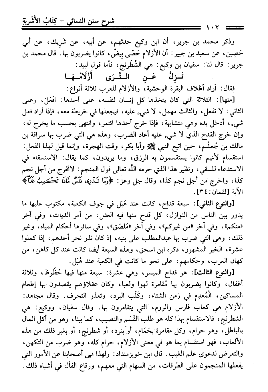 وذكر محمد بن جرير، أن ابن وكيع حدثهم، عن أبيه، عن شَرِيك، عن أبي حَصِين، عن سعيد بن جبير: أن الأزلام حَصّى بِيضٌ، كانوا يضربون بها. قَالَ محمد بن جرير: قَالَ لنا: سفيان بن وكيع: هي الشِّطْرنج، فأما قول لبيد: