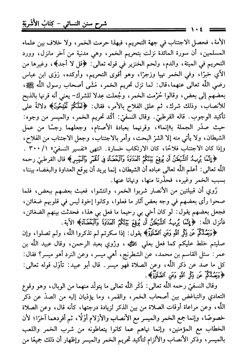 الأمة، فحصل الاجتناب فِي جهة التحريم، فبهذا حرمت الخمر، ولا خلاف بين علماء المسلمين، أن سورة المائدة نزلت بتحريم الخمر، وهي مدنية منْ آخر ما نزل، وورد التحريم فِي الميتة، والدم، ولحم الخنزير فِي قوله تعالى: {قُلْ لَا أَجِدُ}، وغيرها منْ الآي خبرًا، وفي الخمر نهيا وزجرًا، وهو أقوى التحريم، وأوكده، رَوَى ابن عبّاس رضي الله تعالى عنهما، قَالَ: لما نزل تحريم الخمر، مَشَى أصحاب رسول الله -صلى الله عليه وسلم-، بعضهم إلى بعض، وقالوا حُرِّمت الخمر، وجُعلت عِدلا للشرك -يعني أنه قرنها بالذبح للأنصاب، وذلك شرك، ثم علق الفلاح بالأمر، فَقَالَ: {لَعَلَكُمْ تُفْلِحُونَ} دلالةَ عَلَى تأكيد الوجوب. قاله القرطبيّ. وَقَالَ النسفيّ: أكد تحريم الخمر، والميسر منْ وجوه: حيث صدّر الجملة بـ"إنما"، وقرنهما بعبادة الأصنام، وجعلهما رجسًا منْ عمل الشيطان، ولا يأتي منه إلا الشرِّ البحت، وأمر بالاجتناب، وجعل الاجتناب منْ الفلاح، وإذا كَانَ الاجتناب فلاحًا، كَانَ الارتكاب خسارة. انتهى "تفسير النسفيّ" 1/ 300.