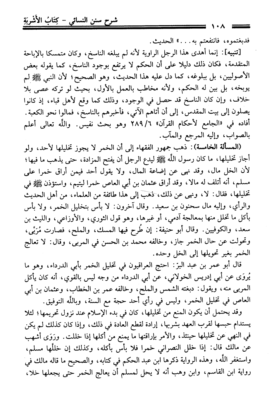 (المسألة الخامسة): ذهب جمهور الفقهاء إلى أن الخمر لا يجوز تخليلها لأحد، ولو أجاز تخليلها، ما كَانَ رسول الله -صلى الله عليه وسلم- ليدع الرجل أن يفتح المزادة، حَتَّى يذهب ما فيها؛ لأن الخل مال، وَقَدْ نهى عن إضاعة المال، ولا يقول أحد فيمن أراق خمرا عَلَى مسلم، أنه أتلف له مالاً، وَقَدْ أراق عثمان بن أبي العاص خمرا ليتيم، واستؤذن -صلى الله عليه وسلم- فِي تخليلها، فَقَالَ: لا، ونهى عن ذلك، ذهب إلى هَذَا طائفة منْ العلماء، منْ أهل الْحَدِيث والرأي، وإليه مال سحنون بن سعيد. وَقَالَ آخرون: لا بأس بتخليل الخمر، ولا بأس بأكل ما تخلل منها بمعالجة آدمي، أو غيرها، وهو قول الثوري، والأوزاعي، والليث بن سعد، والكوفيين. وَقَالَ أبو حنيفة: إن طُرح فيها المسك، والملح، فصارت مُرَبَّى، وتحولت عن حال الخمر جاز، وخالفه محمد بن الحسن فِي المربى، وَقَالَ: لا تعالج الخمر بغير تحويلها إلى الخل وحده.