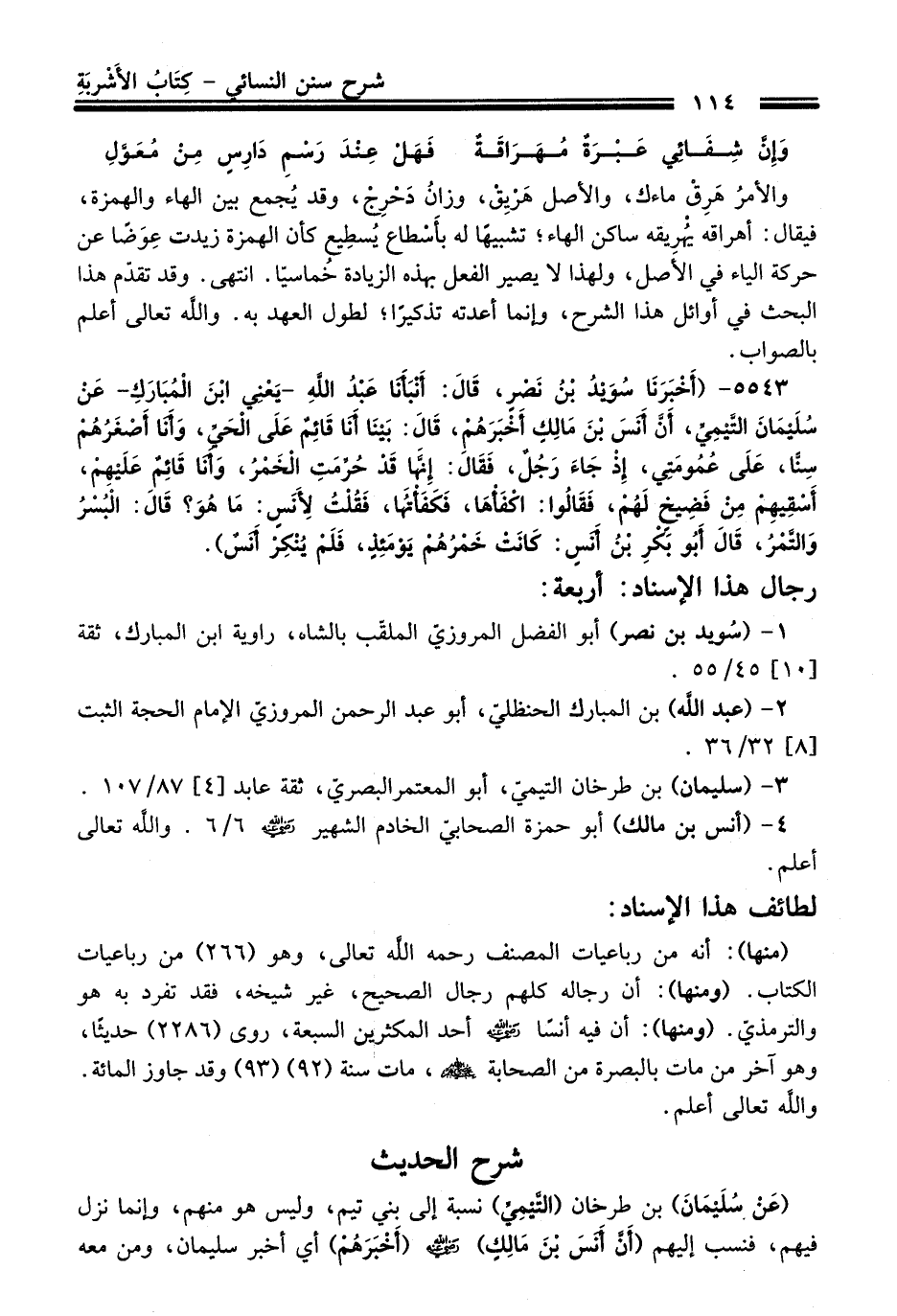 5543 - (أَخْبَرَنَا سُوَيْدُ بْنُ نَصْرٍ، قَالَ: أَنْبَأَنَا عَبْدُ اللَّهِ -يَعْنِي ابْنَ الْمُبَارَكِ- عَنْ سُلَيْمَانَ التَّيْمِيِّ، أَنَّ أَنَسَ بْنَ مَالِكٍ أَخْبَرَهُمْ، قَالَ: بَيْنَا أَنَا قَائِمٌ عَلَى الْحَيِّ، وَأَنَا أَصْغَرُهُمْ سِنًّا، عَلَى عُمُومَتِي، إِذْ جَاءَ رَجُلٌ، فَقَالَ: إِنَّهَا قَدْ حُرِّمَتِ الْخَمْرُ، وَأَنَا قَائِمٌ عَلَيْهِمْ، أَسْقِيهِمْ مِنْ فَضِيخٍ لَهُمْ، فَقَالُوا: اكْفَأْهَا، فَكَفَأْتُهَا، فَقُلْتُ لأَنَسٍ: مَا هُوَ؟ قَالَ: الْبُسْرُ وَالتَّمْرُ، قَالَ أَبُو بَكْرِ بْنُ أَنَسٍ: كَانَتْ خَمْرُهُمْ يَوْمَئِذٍ، فَلَمْ يُنْكِرْ أَنَسٌ).