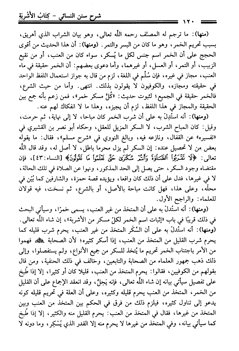(ومنها): أنه استُدِلّ به عَلَى أن شرب الخمر كَانَ مباحا، لا إلى نهاية، ثم حرمت، وقيل: كَانَ المباح الشرب، لا السكر المزيل للعقل، وحكاه أبو نصر بن القشيري فِي "تفسيره" عن القفال، ونازعه فيه، وبالغ النوويّ فِي "شرح مسلم"، فَقَالَ: ما يقوله بعض منْ لا تحصيل عنده: إن السكر لم يزل محرما باطل، لا أصل له، وَقَدْ قَالَ الله تعالى: {لَا تَقْرَبُوا الصَّلَاةَ وَأَنْتُمْ سُكَارَى حَتَّى تَعْلَمُوا مَا تَقُولُونَ} [النِّساء: 43]، فإن مقتضاه وجود السكر، حَتَّى يصل إلى الحد المذكور، ونهوا عن الصلاة فِي تلك الحالة، لا فِي غيرها، فدل عَلَى أن ذلك كَانَ واقعا، ويؤيده قصة حمزة، والشارفين كما بُيّن فِي محلّه، وعلى هَذَا، فهل كانت مباحة بالأصل، أو بالشرع، ثم نسخت، فيه قولان للعلماء: والراجح الأول.
