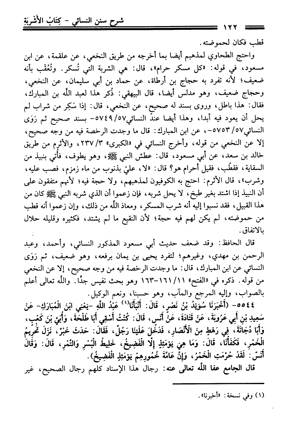 واحتج الطحاوي لمذهبم أيضاً بما أخرجه منْ طريق النخعي، عن علقمة، عن ابن مسعود، فِي قوله: "كل مسكر حرام"، قَالَ: هي الشربة التي تُسكر. وتُعُقّب بأنه ضعيف؛ لأنه تفرد به حجاج بن أرطاة، عن حماد بن أبي سليمان، عن النخعي، وحجاج ضعيف، وهو مدلس أيضاً، قَالَ البيهقي: ذُكر هَذَا لعبد الله بن المبارك، فَقَالَ: هَذَا باطل، وروى بسند له صحيح، عن النخعي، قَالَ: إذا سَكِر منْ شراب لم يحل أن يعود فيه أبدا، وهذا أيضاً عند النسائيّ 57/ 5749 - بسند صحيح ثم رَوَى النسائيّ 57/ 5753 - ، عن ابن المبارك: قَالَ ما وجدت الرخصة فيه منْ وجه صحيح، إلا عن النخعي منْ قوله، وأخرج النسائيّ "الكبرى" 3/ 237، والأثرم منْ طريق خالد بن سعد، عن أبي مسعود، قَالَ: عطش النبيّ -صلى الله عليه وسلم-، وهو يطوف، فأُتي بنبيذ منْ السقاية، فقطّب، فقيل أحرام هو؟ قَالَ: "لا، عليّ بذنوب منْ ماء زمزم، فصب عليه، وشرب"، قَالَ الأثرم: احتج به الكوفيون لمذهبهم، ولا حجة فيه؛ لأنهم متفقون عَلَى أن النبيذ إذا اشتد بغير طبخ، لا يحل شربه، فإن زعموا أن الذي شربه النبيّ -صلى الله عليه وسلم- كَانَ منْ هَذَا القبيل، فقد نسبوا إليه أنه شرب المسكر، ومعاذ الله منْ ذلك، وإن زعموا أنه قطب منْ حموضته، لم يكن لهم فيه حجة؛ لأن النقيع ما لم يشتد، فكثيره وقليله حلال بالاتفاق.