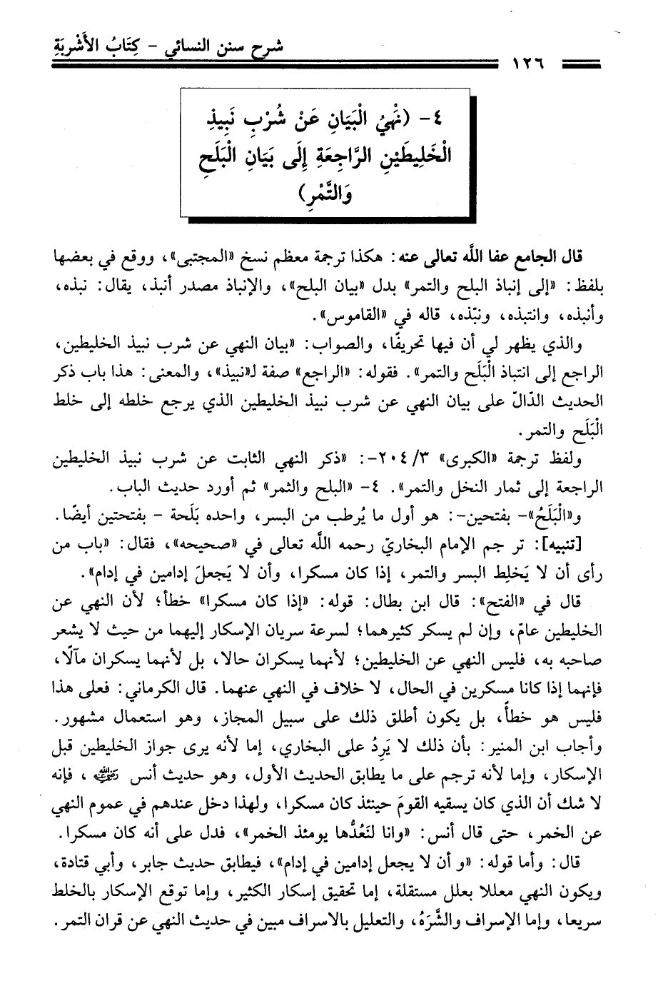 ولفظ ترجمة "الكبرى" 3/ 204 - : "ذكر النهي الثابت عن شرب نبيذ الخليطين الراجعة إلى ثمار النخل والتمر" 4 - "البلح والثمر" ثم أورد حديث الباب.