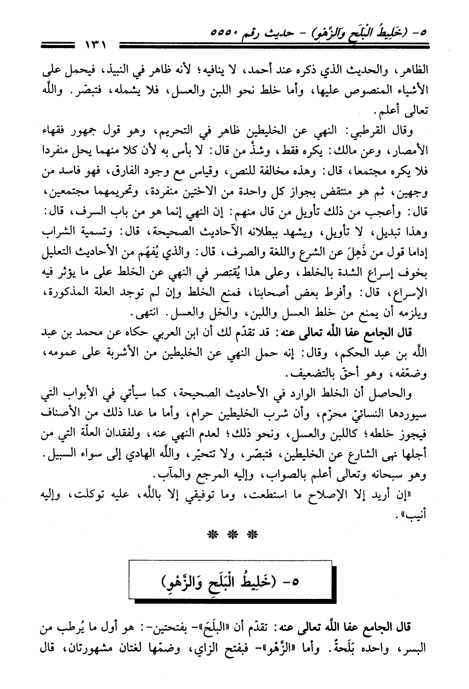 قَالَ الجامع عفا الله تعالى عنه: قد تقدّم لك أن ابن العربي حكاه عن محمد بن عبد الله بن عبد الحكم، وَقَالَ: إنه حمل النهي عن الخليطين منْ الأشربة عَلَى عمومه، وضعّفه، وهو أحقّ بالتضعيف.