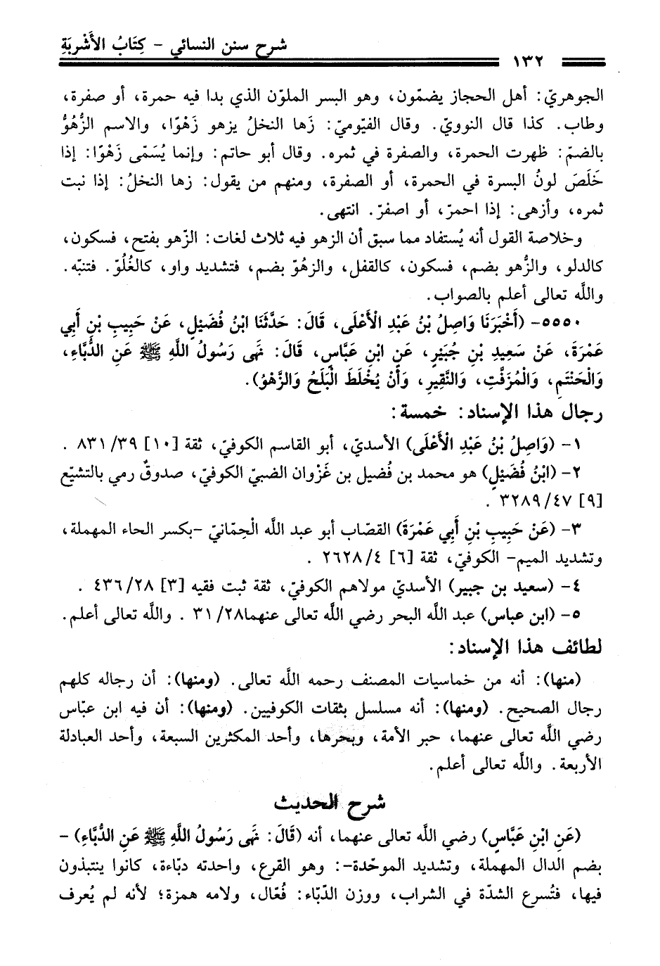 5550 - (أَخْبَرَنَا وَاصِلُ بْنُ عَبْدِ الأَعْلَى، قَالَ: حَدَّثَنَا ابْنُ فُضَيْلٍ، عَنْ حَبِيبِ بْنِ أَبِي عَمْرَةَ، عَنْ سَعِيدِ بْنِ جُبَيْرٍ، عَنِ ابْنِ عَبَّاسٍ، قَالَ: نَهَى رَسُولُ اللَّهِ -صلى الله عليه وسلم- عَنِ الدُّبَّاءِ، وَالْحَنْتَمِ، وَالْمُزَفَّتِ، وَالنَّقِيرِ، وَأَنْ يُخْلَطَ الْبَلَحُ وَالزَّهْوُ).
