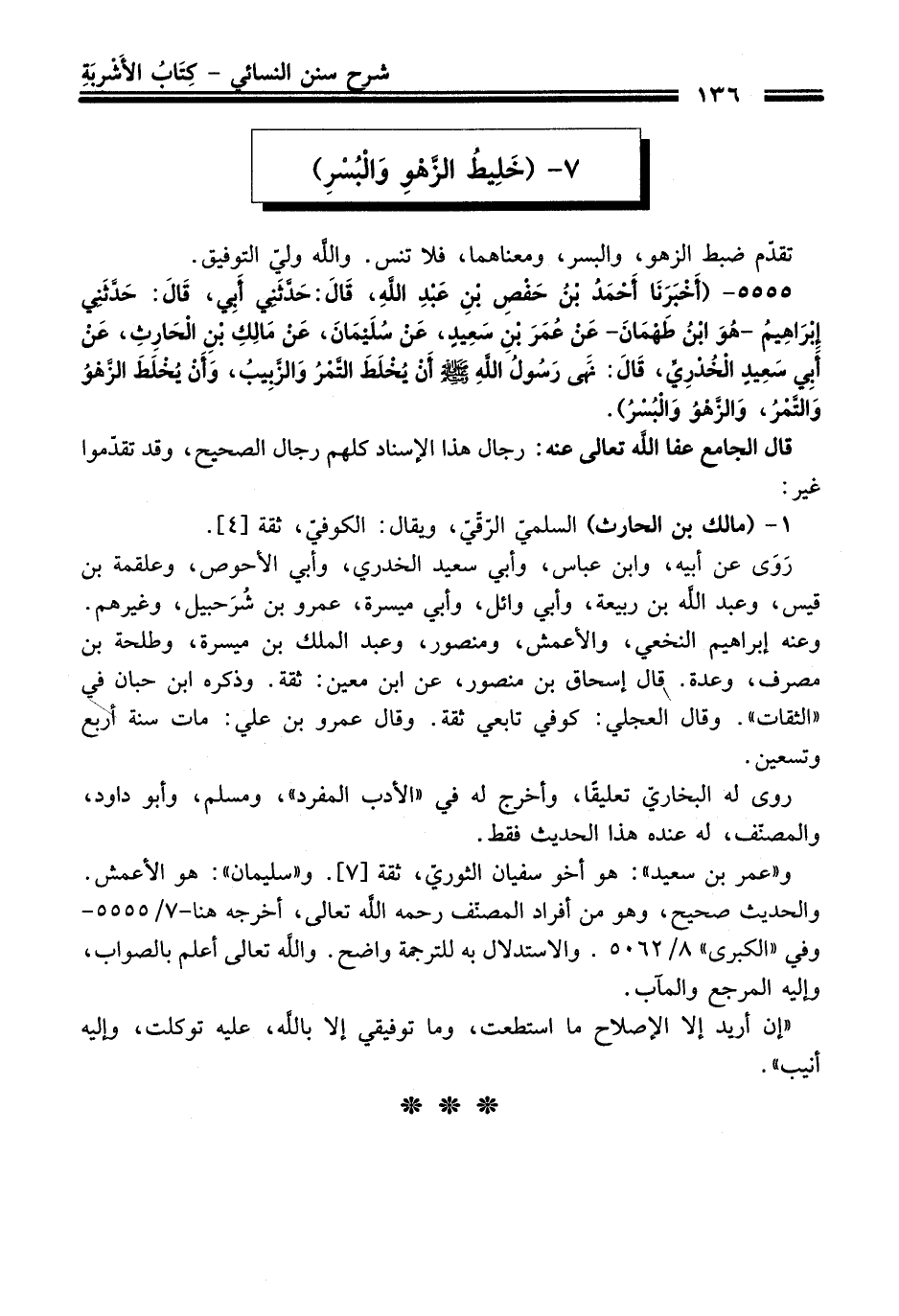 5555 - (أَخْبَرَنَا أَحْمَدُ بْنُ حَفْصِ بْنِ عَبْدِ اللَّهِ، قَالَ: حَدَّثَنِي أَبِي، قَالَ: حَدَّثَنِي إِبْرَاهِيمُ -هُوَ ابْنُ طَهْمَانَ- عَنْ عُمَرَ بْنِ سَعِيدٍ، عَنْ سُلَيْمَانَ، عَنْ مَالِكِ بْنِ الْحَارِثِ، عَنْ أَبِي سَعِيدٍ الْخُدْرِيِّ، قَالَ: نَهَى رَسُولُ اللَّهِ -صلى الله عليه وسلم- أَنْ يُخْلَطَ التَّمْرُ وَالزَّبِيبُ، وَأَنْ يُخْلَطَ الزَّهْوُ وَالتَّمْرُ، وَالزَّهْوُ وَالْبُسْرُ).