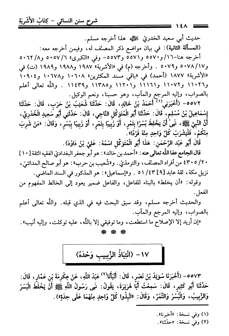 5572 - (أَخْبَرَنِي (¬1) أَحْمَدُ بْنُ خَالِدٍ، قَالَ: حَدَّثَنَا شُعَيْبُ بْنُ حَرْبٍ، قَالَ: حَدَّثَنَا إِسْمَاعِيلُ بْنُ مُسْلِمٍ، قَالَ: حَدَّثَنَا أَبُو الْمُتَوَكِّلِ النَّاجِيُّ، قَالَ: حَدَّثَنِي أَبُو سَعِيدٍ الْخُدْرِيُّ، أَنَّ النَّبِيَّ -صلى الله عليه وسلم-، نَهَى أَنْ يَخْلِطَ بُسْرًا بِتَمْرٍ، أَوْ زَبِيبًا بِتَمْرٍ، أَوْ زَبِيبًا بِبُسْرٍ، وَقَالَ: "مَنْ شَرِبَ مِنْكُمْ، فَلْيَشْرَبْ كُلَّ وَاحِدٍ مِنْهُ فَرْدًا".