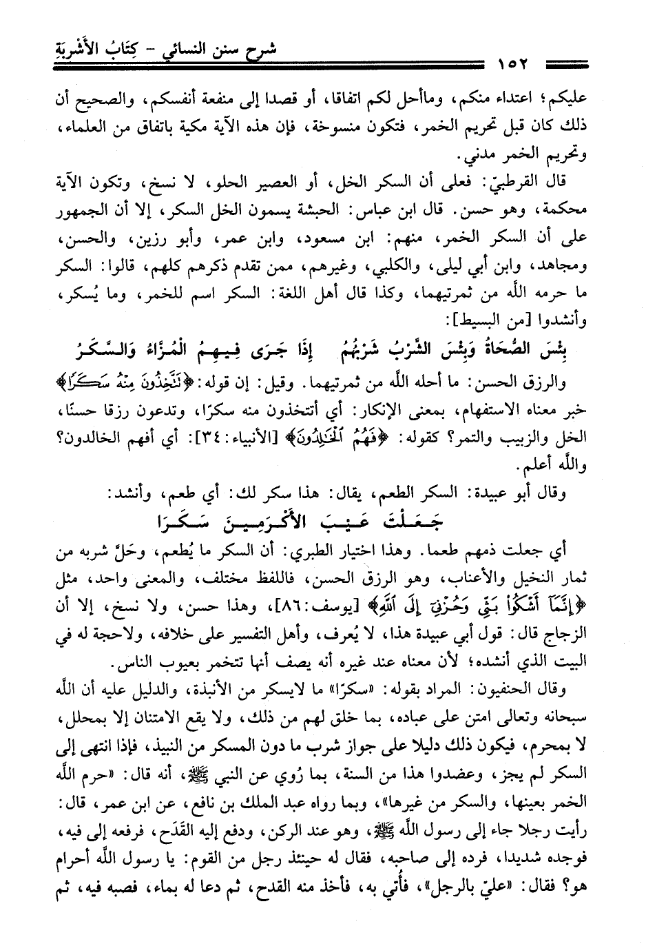 وَقَالَ الحنفيون: المراد بقوده: "سكرًا" ما لا يسكر منْ الأنبذة، والدليل عليه أن الله سبحانه وتعالى امتن عَلَى عباده، بما خلق لهم منْ ذلك، ولا يقع الامتنان إلا بمحلل، لا بمحرم، فيكون ذلك دليلاً عَلَى جواز شرب ما دون المسكر منْ النبيذ، فإذا انتهى إلى السكر لم يجز، وعضدوا هَذَا منْ السنة، بما رُوي عن النبيّ -صلى الله عليه وسلم-، أنه قَالَ: "حرم الله الخمر بعينها، والسكر منْ غيرها"، وبما رواه عبد الملك بن نافع، عن ابن عمر، قَالَ: رأيت رجلاً جاء إلى رسول الله -صلى الله عليه وسلم-، وهو عند الركن، ودفع إليه القَدَح، فرفعه إلى فيه، فوجده شديدا، فرده إلى صاحبه، فَقَالَ له حينئذ رجل منْ القوم: يا رسول الله أحرام هو؟ فَقَالَ: "عليّ بالرجل"، فأتي به، فأخذ منه القدح، ثم دعا له بماء، فصبه فيه، ثم