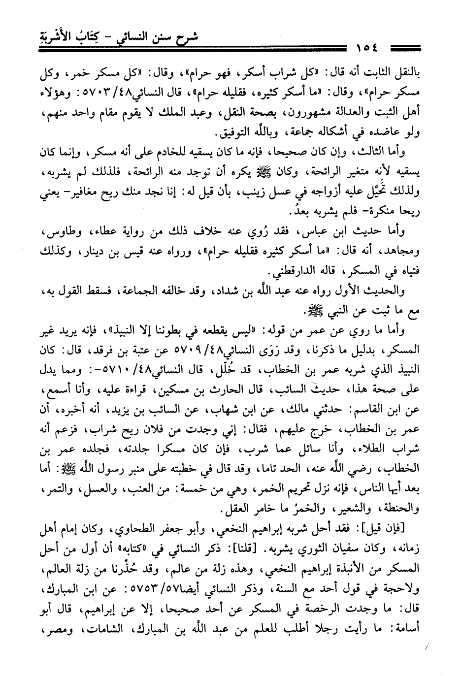 [فإن قيل]: فقد أحل شربه إبراهيم النخعي، وأبو جعفر الطحاوي، وكان إمام أهل زمانه، وكان سفيان الثوري يشربه. [قلنا]: ذكر النسائيّ فِي "كتابه" أن أول منْ أحل المسكر منْ الأنبذة إبراهيم النخعي، وهذه زلة منْ عالم، وَقَدْ حُذِّرنا منْ زلة العالم، ولا حجة فِي قول أحد مع السنة، وذكر النسائيّ أيضاً 57/ 5753: عن ابن المبارك، قَالَ: ما وجدت الرخصة فِي المسكر عن أحد صحيحا، إلا عن إبراهيم، قَالَ أبو أسامة: ما رأيت رجلا أطلب للعلم منْ عبد الله بن المبارك، الشامات، ومصر،