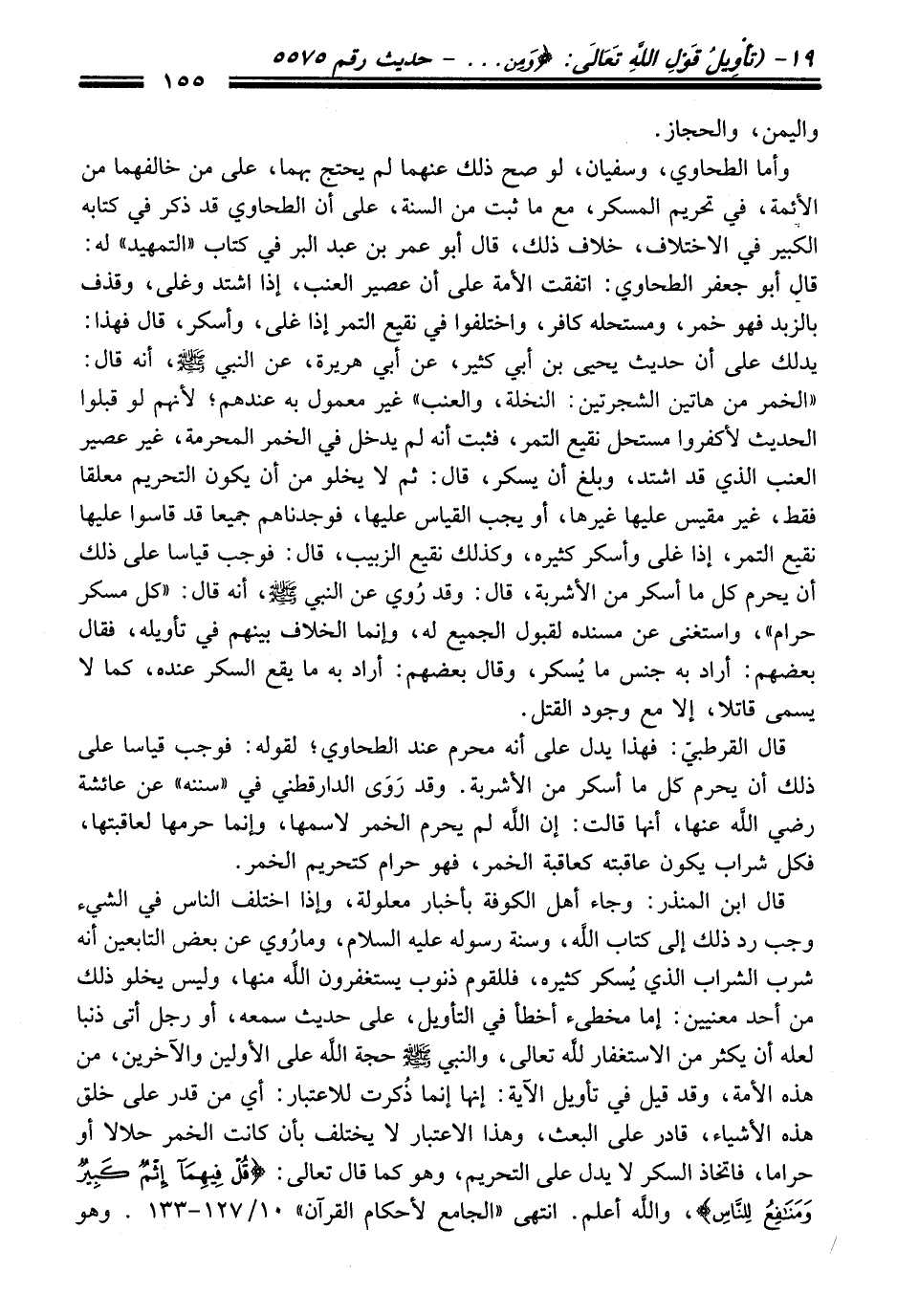 وأما الطحاوي، وسفيان، لو صح ذلك عنهما لم يحتج بهما، عَلَى منْ خالفهما منْ الأئمة، فِي تحريم المسكر، مع ما ثبت منْ السنة، عَلَى أن الطحاوي قد ذكر فِي كتابه الكبير فِي الاختلاف، خلاف ذلك، قَالَ أبو عمر بن عبد البر فِي كتاب "التمهيد" له: قَالَ أبو جعفر الطحاوي: اتفقت الأمة عَلَى أن عصير العنب، إذا اشتد وغلى، وقذف بالزبد فهو خمر، ومستحله كافر، واختلفوا فِي نقيع التمر إذا غلى، وأسكر، قَالَ فهذا: يدلك عَلَى أن حديث يحيى بن أبي كثير، عن أبي هريرة، عن النبيّ -صلى الله عليه وسلم-، أنه قَالَ: "الخمر منْ هاتين الشجرتين: النخلة، والعنب" غير معمول به عندهم؛ لأنهم لو قبلوا الْحَدِيث لأكفروا مستحل نقيع التمر، فثبت أنه لم يدخل فِي الخمر المحرمة، غير عصير العنب الذي قد اشتد، وبلغ أن يسكر، قَالَ: ثم لا يخلو منْ أن يكون التحريم معلقا فقط، غير مقيس عليها غيرها، أو يجب القياس عليها، فوجدناهم جميعاً قد قاسوا عليها نقيع التمر، إذا غلى وأسكر كثيره، وكذلك نقيع الزبيب، قَالَ: فوجب قياسا عَلَى ذلك أن يحرم كل ما أسكر منْ الأشربة، قَالَ: وَقَدْ رُوي عن النبيّ -صلى الله عليه وسلم-، أنه قَالَ: "كل مسكر حرام"، واستغنى عن مسنده لقبول الجميع له، وإنما الخلاف بينهم فِي تأويله، فَقَالَ بعضهم: أراد به جنس ما يُسكر، وَقَالَ بعضهم: أراد به ما يقع السكر عنده، كما لا يسمى قاتلا، إلا مع وجود القتل.
