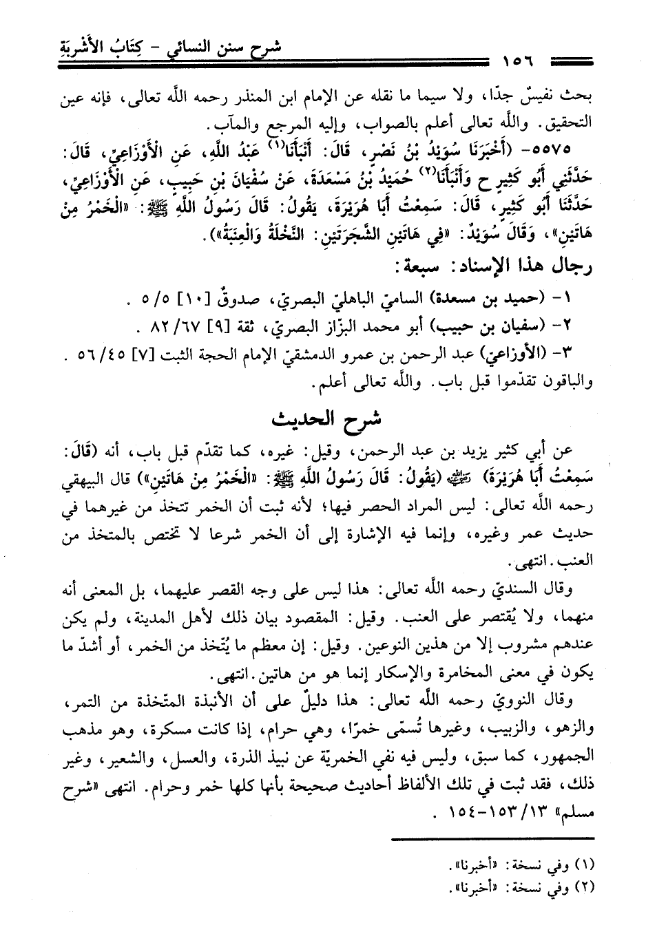5575 - (أَخْبَرَنَا سُوَيْدُ بْنُ نَصْرٍ، قَالَ: أَنْبَأَنَا (¬1) عَبْدُ اللَّهِ، عَنِ الأَوْزَاعِيِّ، قَالَ: حَدَّثَنِي أَبُو كَثِيرٍ ح وَأَنْبَأَنَا (¬2) حُمَيْدُ بْنُ مَسْعَدَةَ، عَنْ سُفْيَانَ بْنِ حَبِيبٍ، عَنِ الأَوْزَاعِيِّ، قَالَ: حَدَّثَنَا أَبُو كَثِيرٍ، قَالَ: سَمِعْتُ أَبَا هُرَيْرَةَ، يَقُولُ: قَالَ رَسُولُ اللَّهِ -صلى الله عليه وسلم-: "الْخَمْرُ مِنْ هَاتَيْنِ"، وَقَالَ سُوَيْدٌ: "فِي هَاتَيْنِ الشَّجَرَتَيْنِ: النَّخْلَةُ وَالْعِنَبَةُ").
