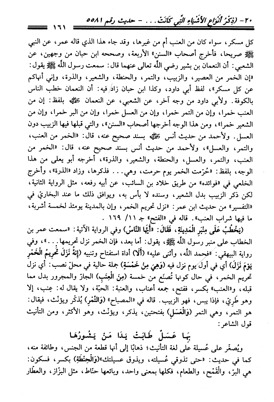 كل مسكر، سواء كَانَ منْ العنب أم منْ غيرها، وَقَدْ جاء هَذَا الذي قاله عمر، عن النبيّ -صلى الله عليه وسلم- صريحا، فأخرج أصحاب "السنن" الأربعة، وصححه ابن حبّان منْ وجهين، عن الشعبي: أن النعمان بن بشير رضي الله تعالى عنهما قَالَ: سمعت رسول الله -صلى الله عليه وسلم- يقول: "إن الخمر منْ العصير، والزبيب، والتمر، والحنطة، والشعير، والذرة، وإني أنهاكم عن كل مسكر"، لفظ أبي داود، وكذا ابن حبّان زاد فيه: أن النعمان خطب النَّاس بالكوفة. ولأبي داود منْ وجه آخر، عن الشعبي، عن النعمان -رضي الله عنه- بلفظ: إن منْ العنب خمرا، وإن منْ التمر خمرا، وإن منْ العسل خمرا، وإن منْ البر خمرا، وإن منْ الشعير خمرا"، ومن هَذَا الوجه أخرجها أصحاب "السنن"، والتي قبلها فيها الزبيب دون العسل. ولأحمد منْ حديث أنس -رضي الله عنه- بسند صحيح عنه، قَالَ: "الخمر منْ العنب، والتمر، والعسل"، ولأحمد منْ حديث أنس بسند صحيح عنه، قَالَ: "الخمر منْ العنب، والتمر، والعسل، والحنطة، والشعير، والذرة"، أخرجه أبو يعلى منْ هَذَا الوجه، بلفظ: "حُرّمت الخمر يوم حرمت، وهي ... فذكرها، وزاد "الذرة"، وأخرج الخلعي فِي "فوائده" منْ طريق خلاد بن السائب، عن أبيه رفعه، مثل الرواية الثانية، لكن ذكر الزبيب بدل الشعير، وسنده لا بأس به، ويوافق ذلك ما عند البخاريّ فِي "التفسير" منْ حديث ابن عمر: "نزل تحريم الخمر، وإن بالمدينة يومئذ لخمسة أشربة، ما فيها شراب العنب". قاله فِي "الفتح" جـ 11/ 169.