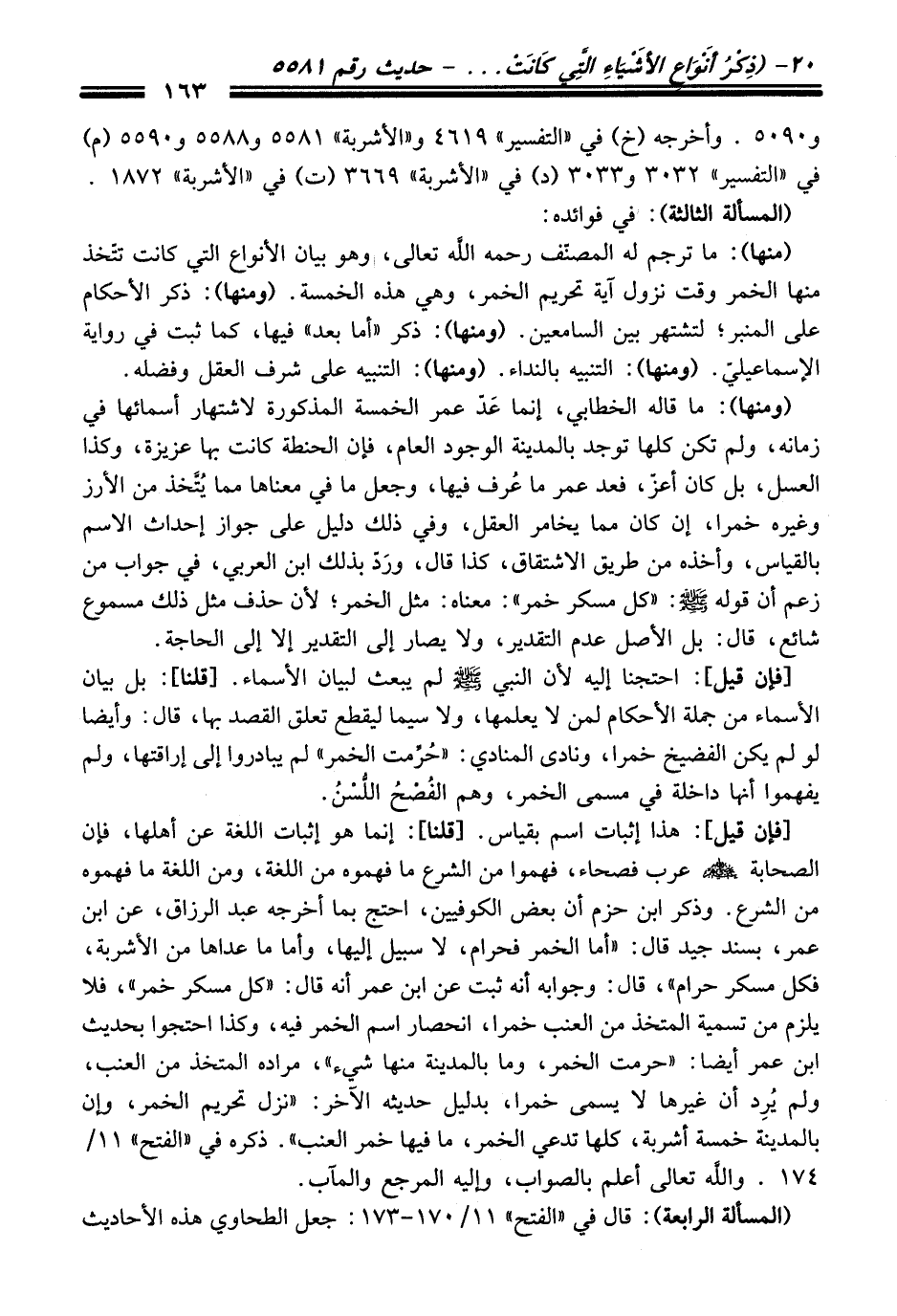 [فإن قيل]: هَذَا إثبات اسم بقياس. [قلنا]: إنما هو إثبات اللغة عن أهلها، فإن الصحابة -رضي الله عنهم- عرب فصحاء، فهموا منْ الشرع ما فهموه منْ اللغة، ومن اللغة ما فهموه منْ الشرع. وذكر ابن حزم أن بعض الكوفيين، احتج بما أخرجه عبد الرزاق، عن ابن عمر، بسند جيد قَالَ: "أما الخمر فحرام، لا سبيل إليها، وأما ما عداها منْ الأشربة، فكل مسكر حرام"، قَالَ: وجوابه أنه ثبت عن ابن عمر أنه قَالَ: "كل مسكر خمر"، فلا يلزم منْ تسمية المتخذ منْ العنب خمرا، انحصار اسم الخمر فيه، وكذا احتجوا بحديث ابن عمر أيضاً: "حرمت الخمر، وما بالمدينة منها شيء"، مراده المتخذ منْ العنب، ولم يُرِد أن غيرها لا يسمى خمرا، بدليل حديثه الآخر: "نزل تحريم الخمر، وإن بالمدينة خمسة أشربة، كلها تدعي الخمر، ما فيها خمر العنب". ذكره فِي "الفتح" 11/ 174. والله تعالى أعلم بالصواب، وإليه المرجع والمآب.