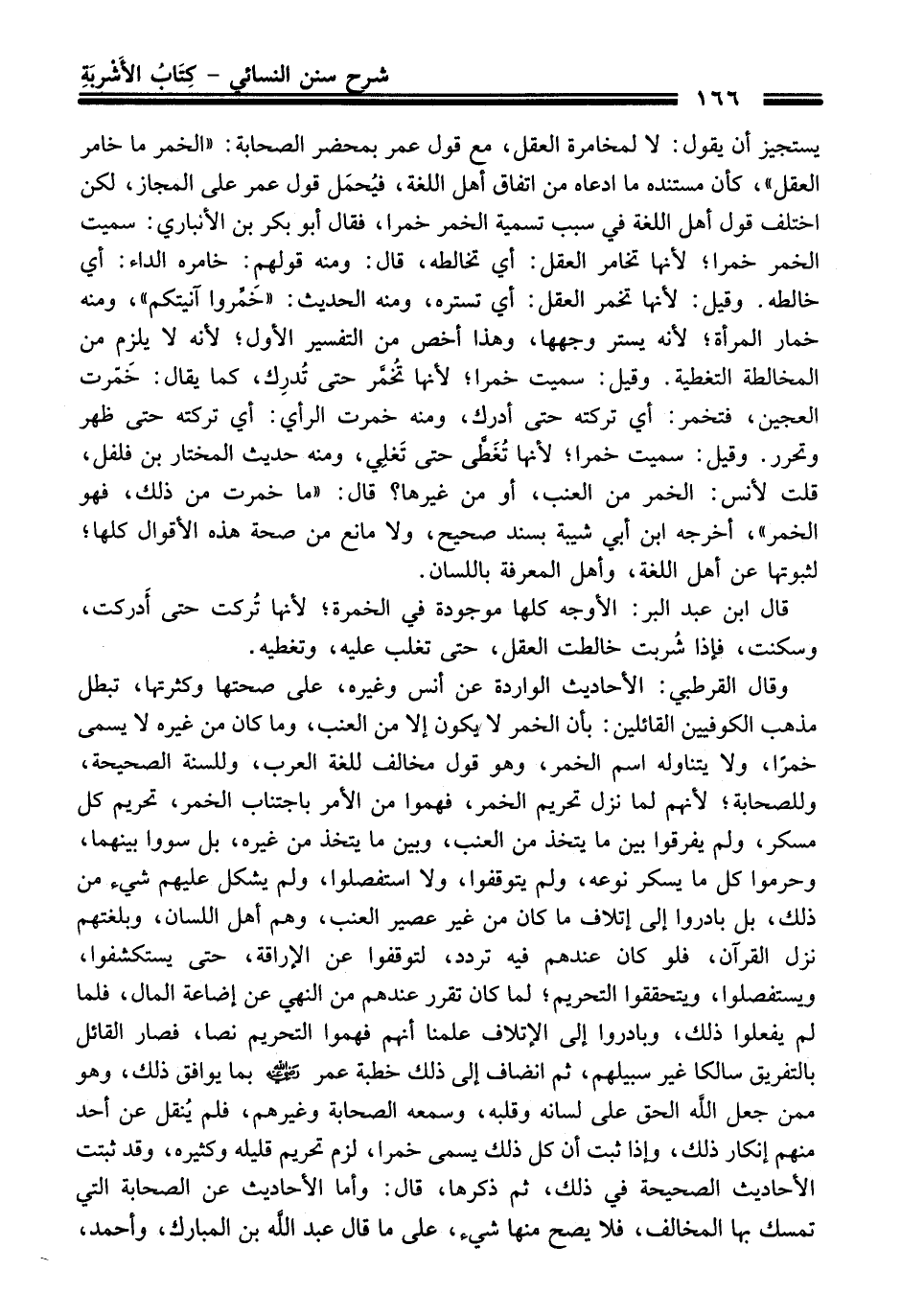 وَقَالَ القرطبيّ: الأحاديث الواردة عن أنس وغيره، عَلَى صحتها وكثرتها، تبطل مذهب الكوفيين القائلين: بأن الخمر لا يكون إلا منْ العنب، وما كَانَ منْ غيره لا يسمى خمرًا, ولا يتناوله اسم الخمر، وهو قول مخالف للغة العرب، وللسنة الصحيحة، وللصحابة؛ لأنهم لما نزل تحريم الخمر، فهموا منْ الأمر باجتناب الخمر، تحريم كل مسكر، ولم يفرقوا بين ما يتخذ منْ العنب، وبين ما يتخذ منْ غيره، بل سووا بينهما، وحرموا كل ما يسكر نوعه، ولم يتوقفوا, ولا استفصلوا , ولم يشكل عليهم شيء منْ ذلك، بل بادروا إلى إتلاف ما كَانَ منْ غير عصير العنب، وهم أهل اللسان، وبلغتهم نزل القرآن، فلو كَانَ عندهم فيه تردد، لتوقفوا عن الإراقة، حَتَّى يستكشفوا، ويستفصلوا، ويتحققوا التحريم؛ لما كَانَ تقرر عندهم منْ النهي عن إضاعة المال، فلما لم يفعلوا ذلك، وبادروا إلى الإتلاف علمنا أنهم فهموا التحريم نصا، فصار القائل بالتفريق سالكا غير سبيلهم، ثم انضاف إلى ذلك خطبة عمر -رضي الله عنه- بما يوافق ذلك، وهو ممن جعل الله الحق عَلَى لسانه وقلبه، وسمعه الصحابة وغيرهم، فلم يُنقل عن أحد منهم إنكار ذلك، وإذا ثبت أن كل ذلك يسمى خمرا، لزم تحريم قليله وكثيره، وَقَدْ ثبتت الأحاديث الصحيحة فِي ذلك، ثم ذكرها، قَالَ: وأما الأحاديث عن الصحابة التي تمسك بها المخالف، فلا يصح منها شيء، عَلَى ما قَالَ عبد الله بن المبارك، وأحمد،