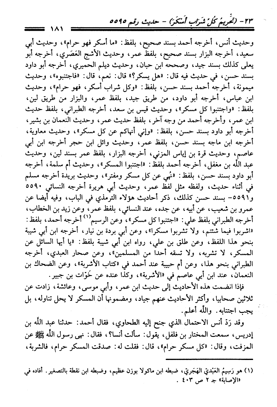 فإذا انضمت هذه الأحاديث إلى حديث ابن عمر، وأبي موسى، وعائشة، زادت عن ثلاثين صحابيا، وأكثر الأحاديث عنهم جياد، ومضمونها أن المسكر لا يحل تناوله، بل يجب اجتنابه. والله أعلم.