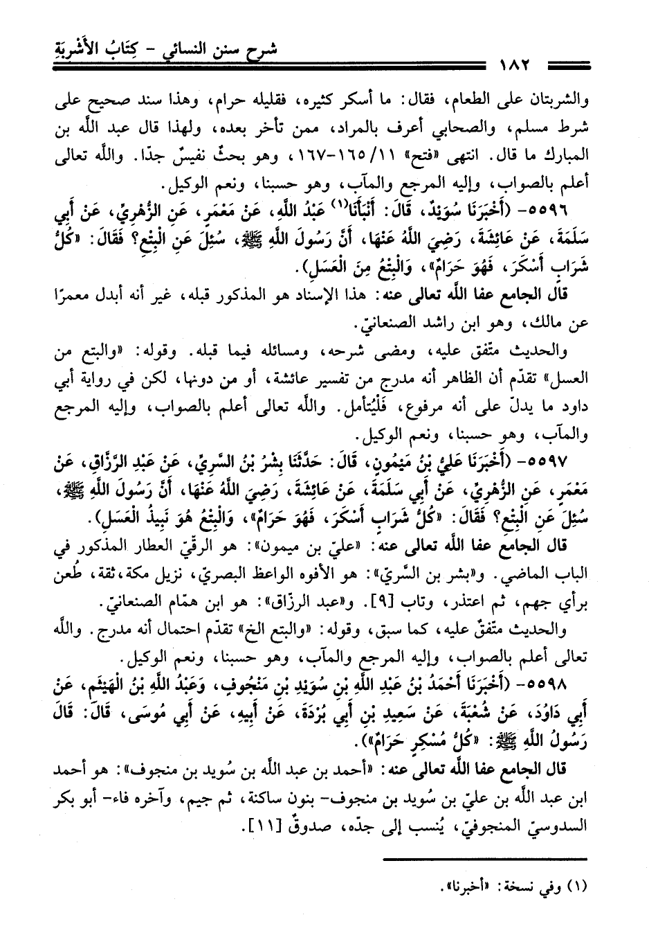 5596 - (أَخْبَرَنَا سُوَيْدٌ، قَالَ: أَنْبَأَنَا (¬1) عَبْدُ اللَّهِ، عَنْ مَعْمَرٍ، عَنِ الزُّهْرِيِّ، عَنْ أَبِي سَلَمَةَ، عَنْ عَائِشَةَ، رضى اللَّهُ عَنْهَا، أَنَّ رَسُولَ اللَّهِ -صلى الله عليه وسلم-، سُئِلَ عَنِ الْبِتْعِ؟ فَقَالَ: "كُلُّ شَرَابٍ أَسْكَرَ، فَهُوَ حَرَامٌ" وَالْبِتْعُ مِنَ الْعَسَلِ).