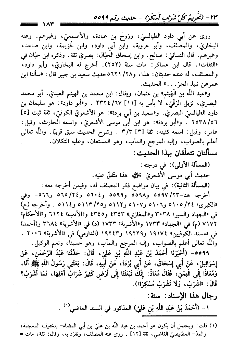 5599 - (أَخْبَرَنَا أَحْمَدُ بْنُ عَبْدِ اللَّهِ بْنِ عَلِيٍّ، قَالَ: حَدَّثَنَا عَبْدُ الرَّحْمَنِ، عَنْ إِسْرَائِيلَ، عَنْ أَبِي إِسْحَاقَ، عَنْ أَبِي بُرْدَةَ، عَنْ أَبِيهِ، قَالَ: بَعَثَنِى رَسُولُ اللَّهِ -صلى الله عليه وسلم- أَنَا، وَمُعَاذٌ إِلَى الْيَمَنِ، فَقَالَ مُعَاذٌ: إِنَّكَ تَبْعَثُنَا إِلَى أَرْضٍ كَثِيرٌ شَرَابُ أَهْلِهَا، فَمَا أَشْرَبُ؟ قَالَ: "اشْرَبْ، وَلاَ تَشْرَبْ مُسْكِرًا").