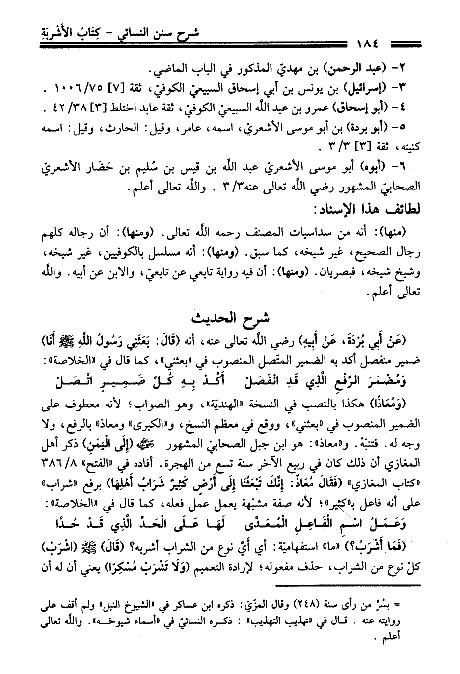 (وَمُعَاذًا) هكذا بالنصب فِي النسخة "الهنديّة"، وهو الصواب؛ لأنه معطوف عَلَى الضمير المنصوب فِي "بعثني"، ووقع فِي معظم النسخ، و"الكبرى" و"معاذ" بالرفع، ولا وجه له. فتنبّه. و"معاذ": هو ابن جبل الصحابيّ المشهور -رضي الله عنه- (إِلَى الْيَمَنِ) ذكر أهل المغازي أن ذلك كَانَ فِي ربيع الآخر سنة تسع منْ الهجرة. أفاده فِي "الفتح" 8/ 386 "كتاب المغازي" (فَقَالَ مُعَاذ: إِنَّكَ تَبعَثُنَا إِلَى أَرْضٍ كَثِيرٌ شَرَابُ أَهْلِهَا) برفع "شراب" عَلَى أنه فاعل بـ"كثير"؛ لأنه صفة مشبّهة يعمل عمل فعله، كما قَالَ فِي "الخلاصة":