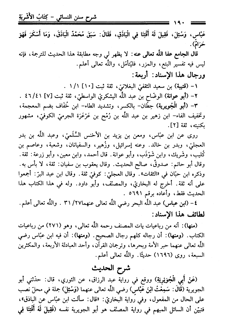 عَبَّاسٍ، وَسُئِلَ، فَقِيلَ لَهُ أَفْتِنَا فِي الْبَاذَقِ، فَقَالَ: سَبَقَ مُحَمَّدٌ الْبَاذَقَ، وَمَا أَسْكَرَ فَهُوَ حَرَامٌ).