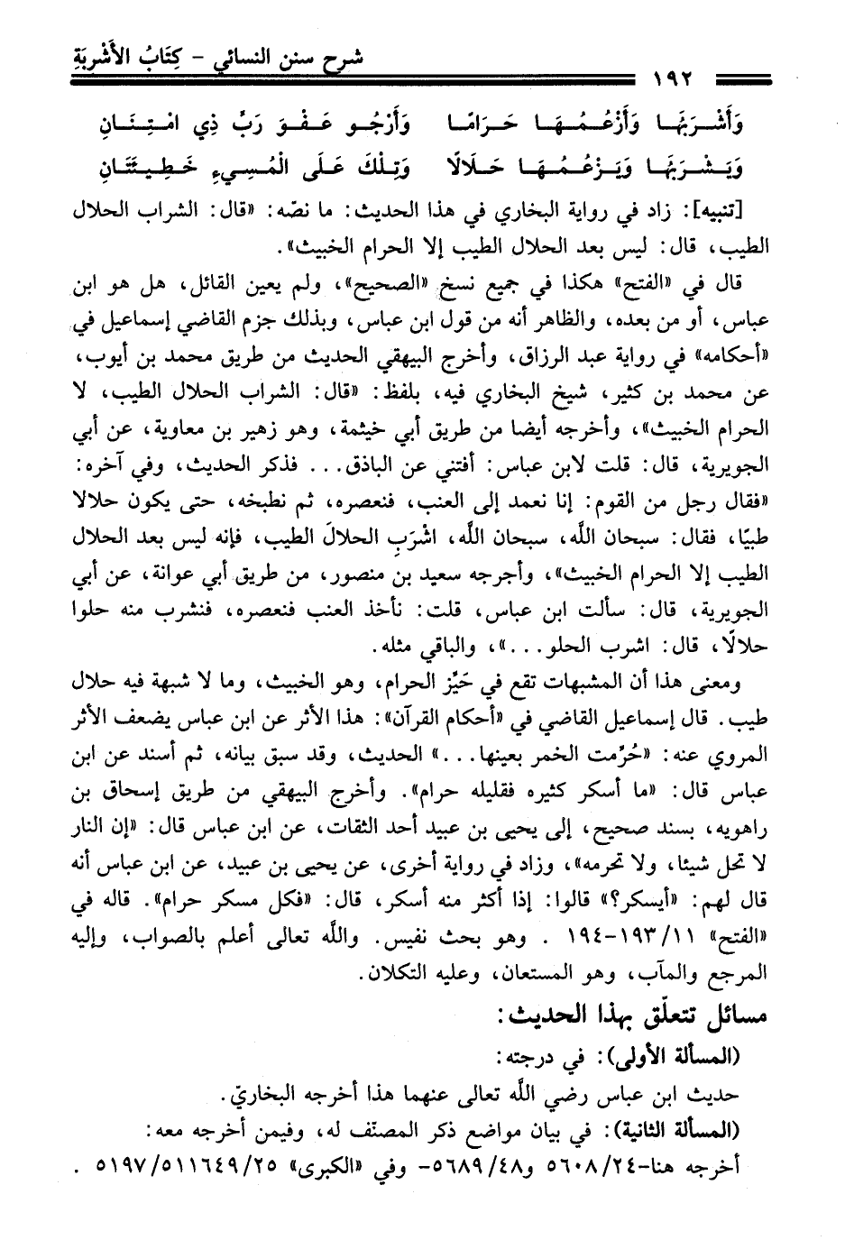 ومعنى هَذَا أن المشبهات تقع فِي حَيِّز الحرام، وهو الخبيث، وما لا شبهة فيه حلال طيب. قَالَ إسماعيل القاضي فِي "أحكام القرآن": هَذَا الأثر عن ابن عبّاس يضعف الأثر المروي عنه: "حُرِّمت الخمر بعينها ... " الْحَدِيث، وَقَدْ سبق بيانه، ثم أسند عن ابن عبّاس قَالَ: "ما أسكر كثيره فقليله حرام". وأخرج البيهقي منْ طريق إسحاق بن راهويه، بسند صحيح، إلى يحيى بن عبيد أحد الثقات، عن ابن عبّاس قَالَ: "إن النار لا تحل شيئاً، ولا تحرمه"، وزاد فِي رواية أخرى، عن يحيى بن عبيد، عن ابن عبّاس أنه قَالَ لهم: "أيسكر؟ " قالوا: إذا أكثر منه أسكر، قَالَ: "فكل مسكر حرام". قاله فِي "الفتح" 11/ 193 - 194. وهو بحث نفيس. والله تعالى أعلم بالصواب، وإليه المرجع والمآب، وهو المستعان، وعليه التكلان.