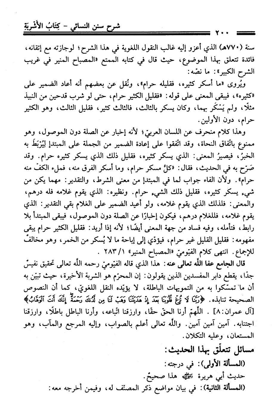 قَالَ الجامع عفا الله تعالى عنه: هَذَا الذي قاله الفيّوميّ رحمه الله تعالى تحقيق نفيسٌ جدًّا، يقطع دابر المفسدين الذين يقولون: إن المحرّم هو الشربة الأخيرة، حيث تبيّن به أن ما تمسّكوا به منْ التمويهات الباطلة، لا يؤيّده النقل اللغويّ، كما أن النصوص الصحيحة تنابذه. {رَبَّنَا لَا تُزِغْ قُلُوبَنَا بَعْدَ إِذْ هَدَيْتَنَا وَهَبْ لَنَا مِنْ لَدُنْكَ رَحْمَةً إِنَّكَ أَنْتَ الْوَهَّابُ} [آل عمران: 8]. اللَّهمّ أرنا الحقّ حقًّا، وارزقنا اتّباعه، وأرنا الباطل باطلاً، وارزقنا اجتنابه. آمين آمين آمين. والله تعالى أعلم بالصواب، وإليه المرجع والمآب، وهو المستعان، وعليه التكلان.