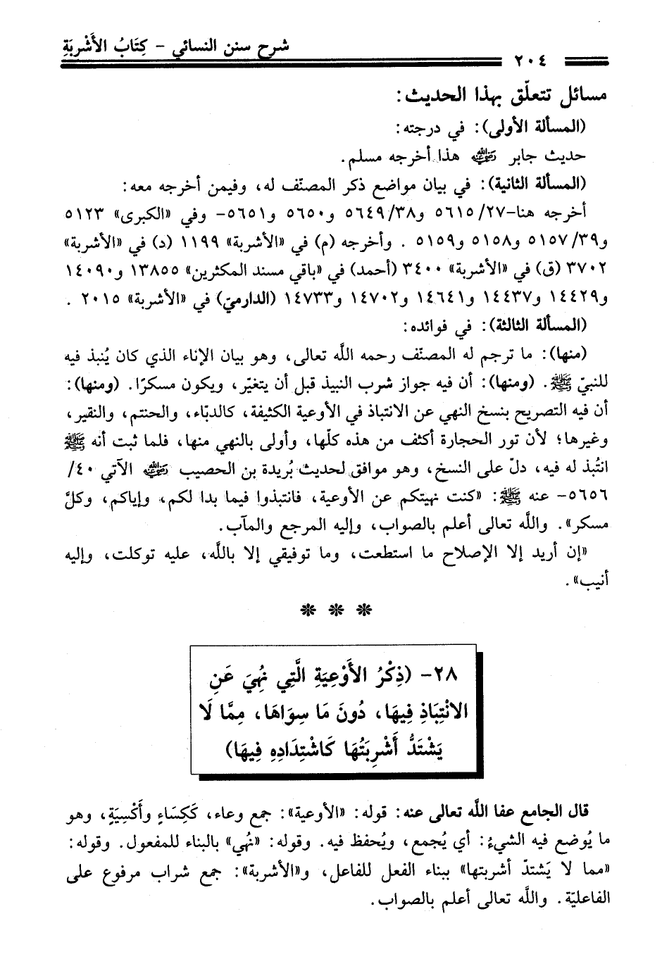 قَالَ الجامع عفا الله تعالى عنه: قوله: "الأوعية": جمع وعاء، كَكِسَاءٍ وأَكسِيَةٍ، وهو ما يُوضع فيه الشيءُ: أي يُجمع، ويُحفظ فيه. وقوله: "نهُي" بالبناء للمفعول. وقوله: "مما لا يَشتدّ أشربتها" ببناء الفعل للفاعل، و"الأشربة": جمع شراب مرفوع عَلَى الفاعليّة. والله تعالى أعلم بالصواب.