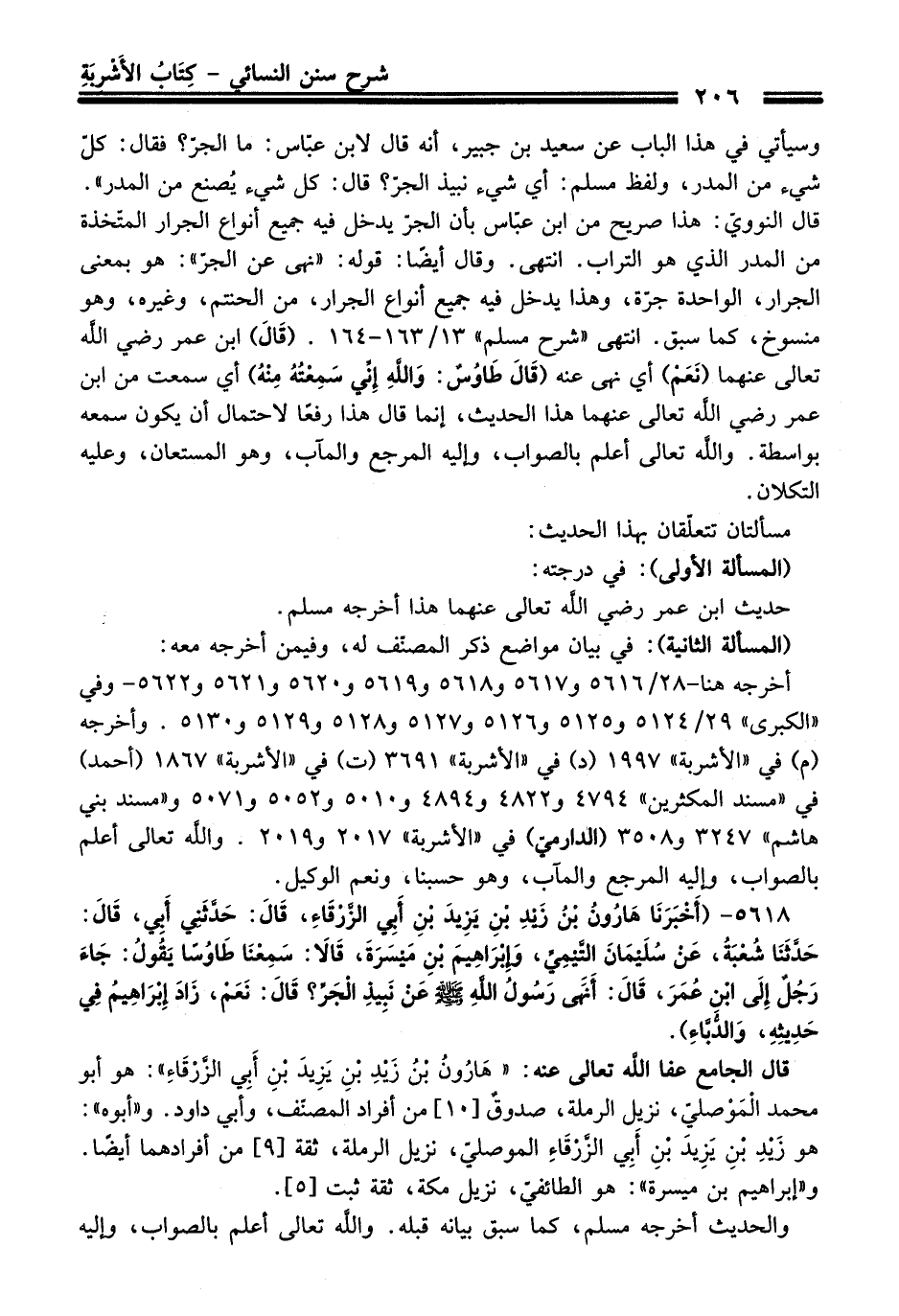 5618 - (أَخْبَرَنَا هَارُونُ بْنُ زَيْدِ بْنِ يَزِيدَ بْنِ أَبِي الزَّرْقَاءِ، قَالَ: حَدَّثَنِي أَبِي، قَالَ: حَدَّثَنَا شُعْبَةُ، عَنْ سُلَيْمَانَ التَّيْمِيِّ، وَإِبْرَاهِيمَ بْنِ مَيْسَرَةَ، قَالاَ: سَمِعْنَا طَاوُسًا يَقُولُ: جَاءَ رَجُلٌ إِلَى ابْنِ عُمَرَ، قَالَ: أَنَهَى رَسُولُ اللَّهِ -صلى الله عليه وسلم- عَنْ نَبِيذِ الْجَرِّ؟ قَالَ: نَعَمْ، زَادَ إِبْرَاهِيمُ فِي حَدِيثِهِ، وَالدُّبَّاءِ).