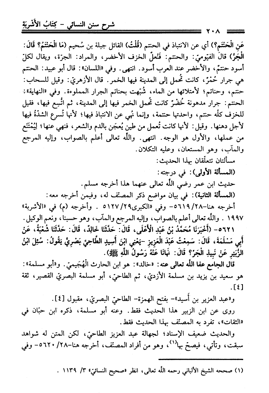 5621 - (أَخْبَرَنَا مُحَمَّدُ بْنُ عَبْدِ الأَعْلَى، قَالَ: حَدَّثَنَا خَالِدٌ، قَالَ: حَدَّثَنَا شُعْبَةُ، عَنْ أَبِي مَسْلَمَةَ، قَالَ: سَمِعْتُ عَبْدَ الْعَزِيزِ -يَعْنِي ابْنَ أَسِيدٍ الطَّاحِيَّ بَصْرِيٌّ- يَقُولُ: سُئِلَ ابْنُ الزُّبَيْرِ عَنْ نَبِيذِ الْجَرِّ؟ قَالَ: نَهَانَا عَنْهُ رَسُولُ اللَّهِ -صلى الله عليه وسلم-).