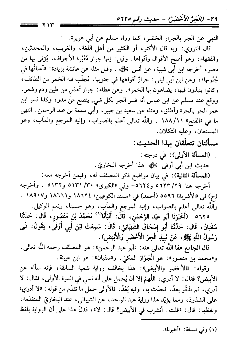 5625 - (أَخْبَرَنَا أَبُو عَبْدِ الرَّحْمَنِ، قَالَ: أَنْبَأَنَا (¬1) مُحَمَّدُ بْنُ مَنْصُورٍ، قَالَ: حَدَّثَنَا سُفْيَانُ، قَالَ: حَدَّثَنَا أَبُو إِسْحَاقَ الشَّيْبَانِيُّ، قَالَ: سَمِعْتُ ابْنَ أَبِي أَوْفَى، يَقُولُ: نَهَى رَسُولُ اللَّهِ -صلى الله عليه وسلم-، عَنْ نَبِيذِ الْجَرِّ الأَخْضَرِ وَالأَبْيَضِ).