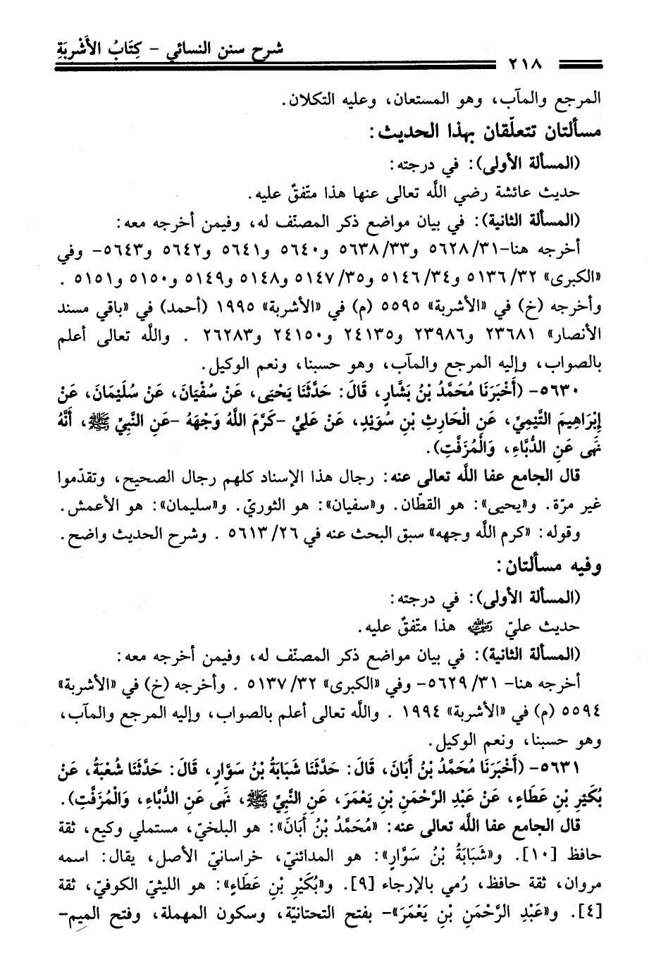 5631 - (أَخْبَرَنَا مُحَمَّدُ بْنُ أَبَانَ، قَالَ: حَدَّثَنَا شَبَابَةُ بْنُ سَوَّارٍ، قَالَ: حَدَّثَنَا شُعْبَةُ، عَنْ بُكَيْرِ بْنِ عَطَاءٍ، عَنْ عَبْدِ الرَّحْمَنِ بْنِ يَعْمَرَ، عَنِ النَّبِيِّ -صلى الله عليه وسلم-، نَهَى عَنِ الدُّبَّاءِ، وَالْمُزَفَّتِ).