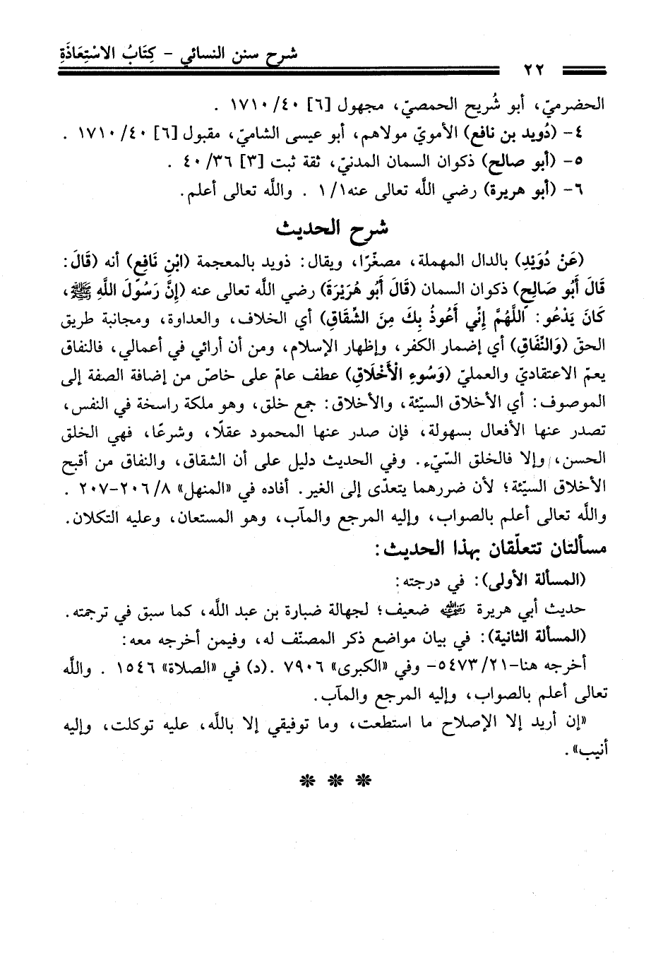 (عَنْ دُوَيْدِ) بالدال المهملة، مصغّرًا، ويقال: ذويد بالمعجمة (ابْنِ نَافِع) أنه (قَالَ: قَالَ أبُو صَالِحٍ) ذكران السمان (قَالَ أَبُو هُرَيْرَةَ) رضي الله تعالى عنه (إِنَّ رَسُوَلَ اللهِ -صلى الله عليه وسلم-، كَانَ يَدْعُو: اللَّهمَّ إِنِّي أَعُوذُ بِكَ مِنَ الشِّقَاقِ) أي الخلاف، والعداوة، ومجانبة طريق الحقّ (وَالنِّفَاقِ) أي إضمار الكَفر، وإظهار الإِسلام، ومن أن أرائي فِي أعمالي، فالنفاق يعمّ الاعتقاديّ والعمليّ (وَسُوءِ الْأَخْلَاقِ) عطف عامّ عَلَى خاصّ منْ إضافة الصفة إلى الموصوف: أي الأخلاق السيّئة، والأخلاق: جمع خلق، وهو ملكة راسخة فِي النفس، تصدر عنها الأفعال بسهولة، فإن صدر عنها المحمود عقلًا، وشرعًا، فهي الخلق الحسن، وإلا فالخلق السّيّء. وفي الْحَدِيث دليل عَلَى أن الشقاق، والنفاق منْ أقبح الأخلاق السّيئة؛ لأن ضررهما يتعدّى إلى الغير. أفاده فِي "المنهل" 8/ 206 - 207. والله تعالى أعلم بالصواب، وإليه المرجع والمآب، وهو المستعان، وعليه التكلان.