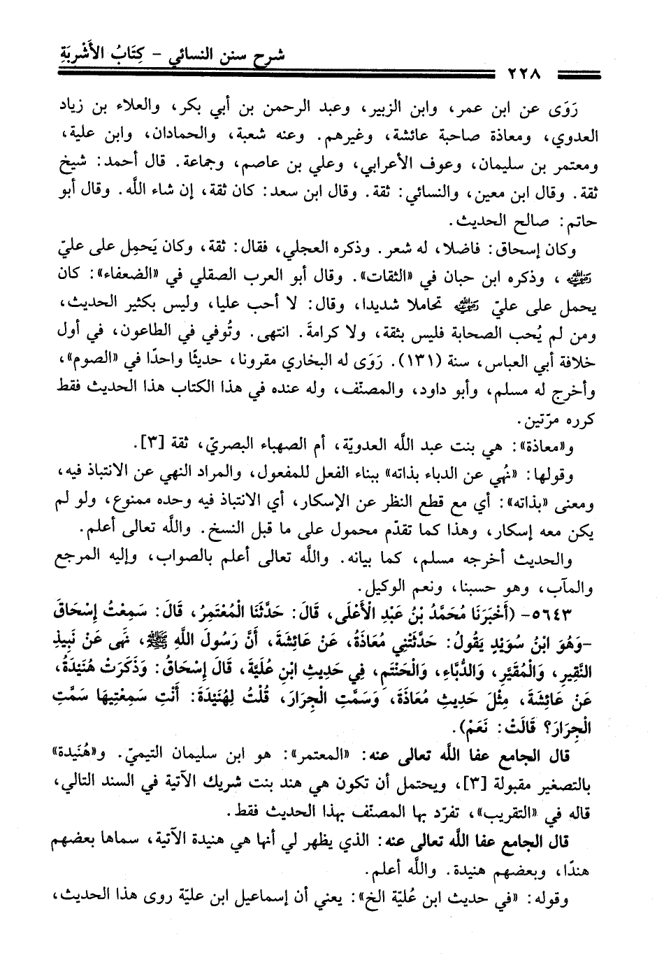 5643 - (أَخْبَرَنَا مُحَمَّدُ بْنُ عَبْدِ الأَعْلَى، قَالَ: حَدَّثَنَا الْمُعْتَمِرُ، قَالَ: سَمِعْتُ إِسْحَاقَ -وَهُوَ ابْنُ سُوَيْدٍ- يَقُولُ: حَدَّثَتْنِى مُعَاذَةُ، عَنْ عَائِشَةَ، أَنَّ رَسُولَ اللَّهِ -صلى الله عليه وسلم-، نَهَى عَنْ نَبِيذِ النَّقِيرِ، وَالْمُقَيَّرِ، وَالدُّبَّاءِ، وَالْحَنْتَمِ، فِي حَدِيثِ ابْنِ عُلَيَّةَ، قَالَ إِسْحَاقُ: وَذَكَرَتْ هُنَيْدَةُ، عَنْ عَائِشَةَ، مِثْلَ حَدِيثِ مُعَاذَةَ، وَسَمَّتِ الْجِرَارَ، قُلْتُ لِهُنَيْدَةَ: أَنْتِ سَمِعْتِيهَا سَمَّتِ الْجِرَارَ؟ قَالَتْ: نَعَمْ).