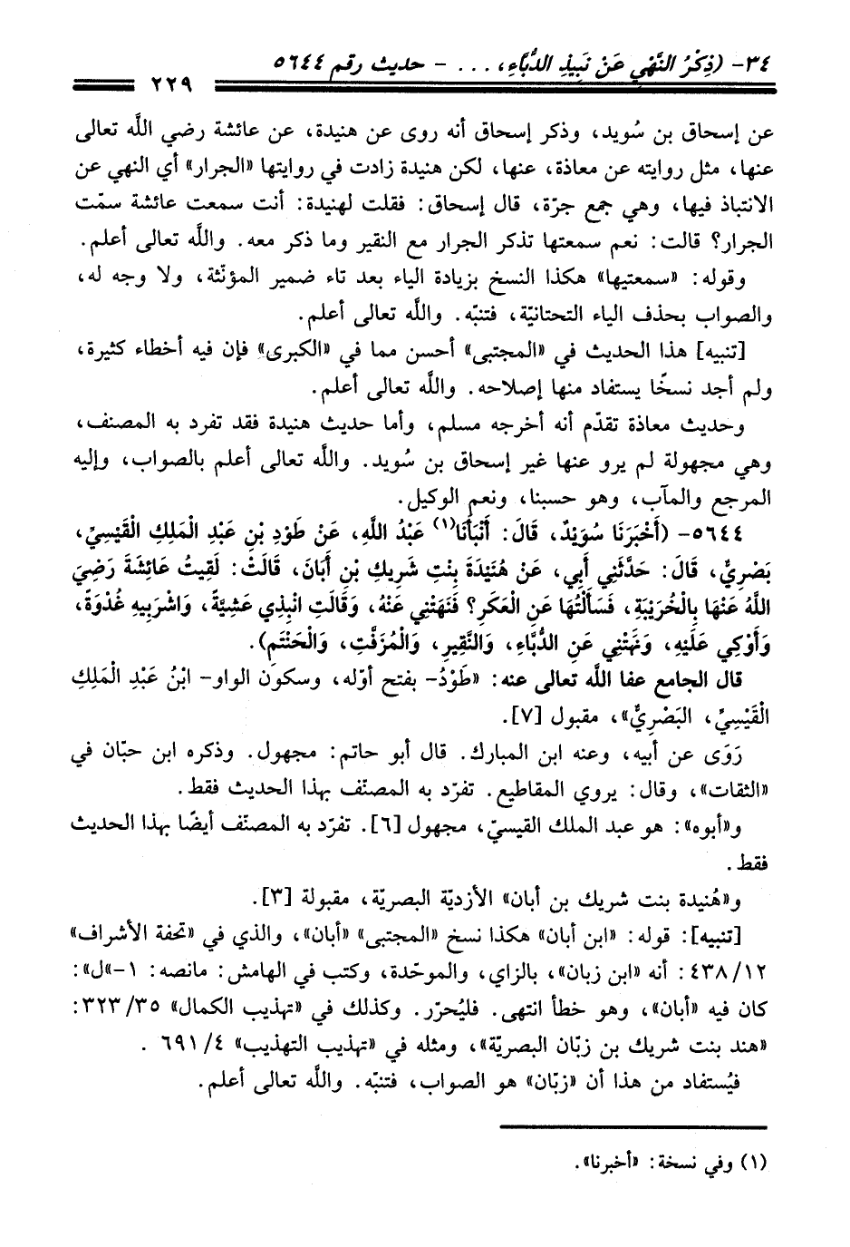 [تنبيه]: قوله: "ابن أبان " هكذا نسخ "المجتبى" "أبان"، والذي فِي "تحفة الأشراف" 12/ 438: أنه "ابن زبان"، بالزاي، والموحّدة، وكتب فِي الهامش: ما نصه: 1 - "ل": كَانَ فيه "أبان"، وهو خطأ انتهى. فليُحرّر. وكذلك فِي "تهذيب الكمال" 35/ 323: "هند بنت شريك بن زبّان البصرية"، ومثله فِي "تهذيب التهذيب" 4/ 691.