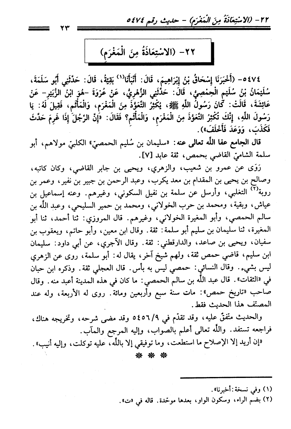 5474 - (أَخْبَرَنَا إِسْحَاقُ بْنُ إِبْرَاهِيمَ، قَالَ: أَنْبَأَنَا (¬1) بَقِيَّةُ، قَالَ: حَدَّثَنِي أَبُو سَلَمَةَ، سُلَيْمَانُ بْنُ سُلَيْمٍ الْحِمْصِيُّ، قَالَ: حَدَّثَنِي الزُّهْرِيُّ، عَنْ عُرْوَةَ -هُوَ ابْنُ الزُّبَيْرِ- عَنْ عَائِشَةَ، قَالَتْ: كَانَ رَسُولُ اللَّهِ -صلى الله عليه وسلم-، يُكْثِرُ التَّعَوُّذَ مِنَ الْمَغْرَمِ، وَالْمَأْثَمِ، فَقِيلَ لَهُ: يَا رَسُولَ اللَّهِ، إِنَّكَ تُكْثِرُ التَّعَوُّذَ مِنَ الْمَغْرَمِ، وَالْمَأْثَمِ؟ فَقَالَ: "إِنَّ الرَّجُلَ إِذَا غَرِمَ حَدَّثَ فَكَذَبَ، وَوَعَدَ فَأَخْلَفَ").