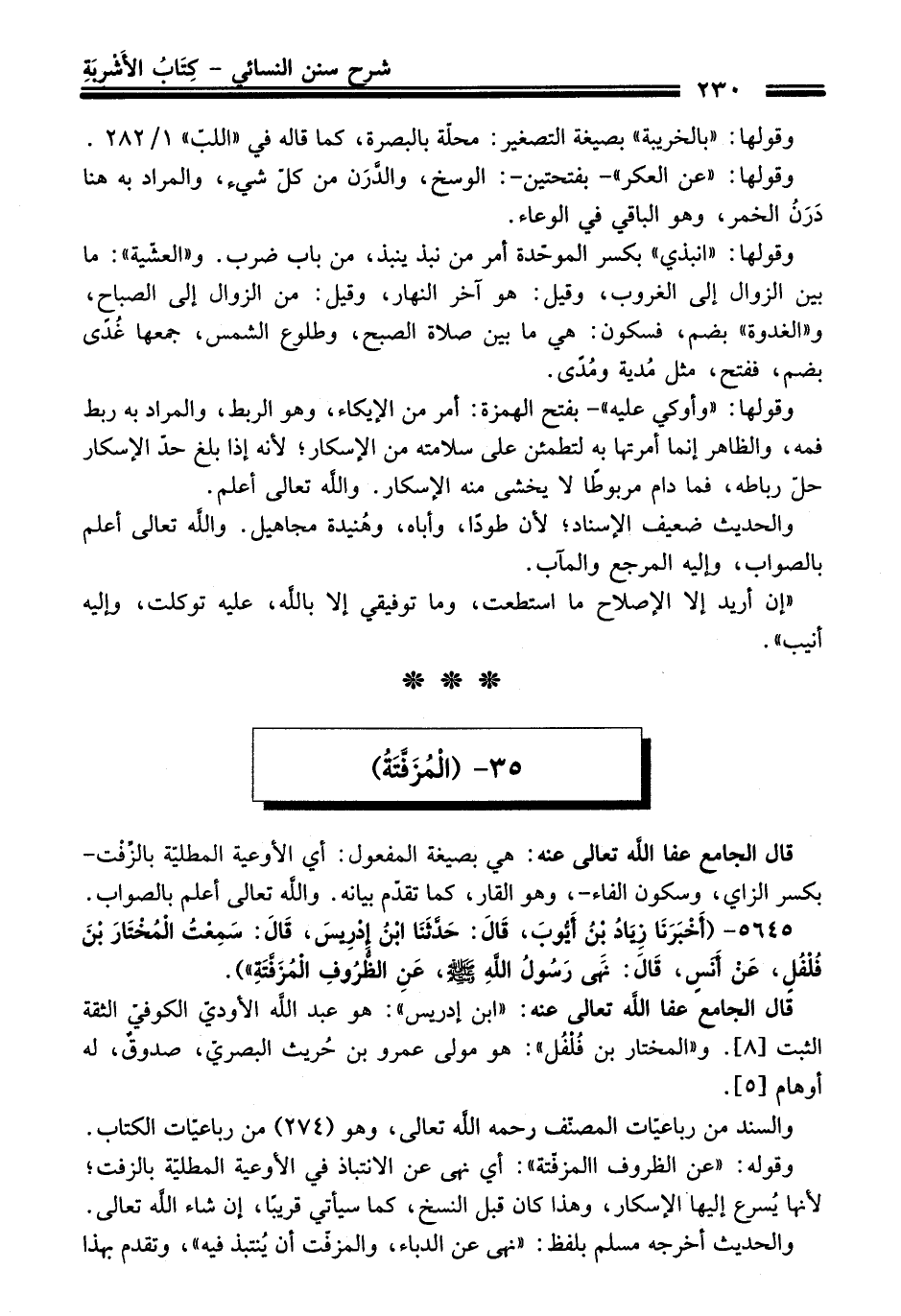 5645 - (أَخْبَرَنَا زِيَادُ بْنُ أَيُّوبَ، قَالَ: حَدَّثَنَا ابْنُ إِدْرِيسَ، قَالَ: سَمِعْتُ الْمُخْتَارَ بْنَ فُلْفُلٍ، عَنْ أَنَسٍ، قَالَ: نَهَى رَسُولُ اللَّهِ -صلى الله عليه وسلم-، عَنِ الظُّرُوفِ الْمُزَفَّتَةِ).