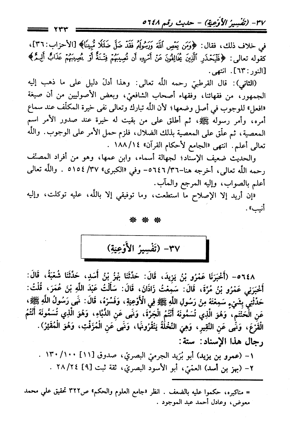 5648 - (أَخْبَرَنَا عَمْرُو بْنُ يَزِيدَ، قَالَ: حَدَّثَنَا بَهْزُ بْنُ أَسَدٍ، قَالَ: حَدَّثَنَا شُعْبَةُ، قَالَ: أَخْبَرَنِي عَمْرُو بْنُ مُرَّةَ، قَالَ: سَمِعْتُ زَاذَانَ، قَالَ: سَأَلْتُ عَبْدَ اللَّهِ بْنَ عُمَرَ، قُلْتُ: حَدِّثْنِي بِشَيْءٍ سَمِعْتَهُ مِنْ رَسُولِ اللَّهِ -صلى الله عليه وسلم- فِي الأَوْعِيَةِ، وَفَسِّرْهُ، قَالَ: نَهَى رَسُولُ اللَّهِ -صلى الله عليه وسلم-، عَنِ الْحَنْتَمِ، وَهُوَ الَّذِي تُسَمُّونَهُ أَنْتُمُ الْجَرَّةَ، وَنَهَى عَنِ الدُّبَّاءِ، وَهُوَ الَّذِي تُسَمُّونَهُ أَنْتُمُ الْقَرْعَ، وَنَهَى عَنِ النَّقِيرِ، وَهِىَ النَّخْلَةُ يَنْقُرُونَهَا، وَنَهَى عَنِ الْمُزَفَّتِ، وَهُوَ الْمُقَيَّرُ).