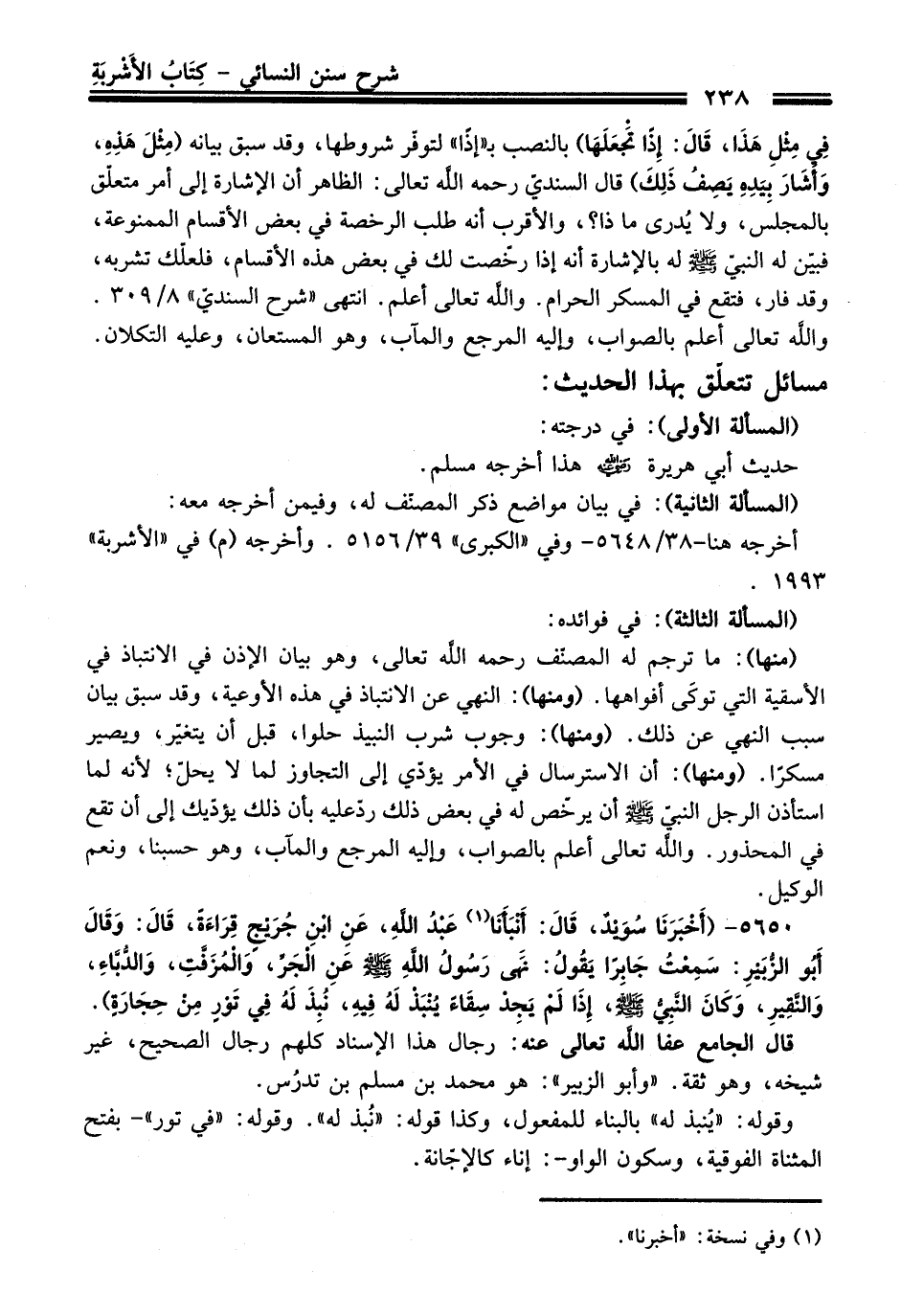 5650 - (أَخْبَرَنَا سُوَيْدٌ، قَالَ: أَنْبَأَنَا (¬1) عَبْدُ اللَّهِ، عَنِ ابْنِ جُرَيْجٍ قِرَاءَةً، قَالَ: وَقَالَ أَبُو الزُّبَيْرِ: سَمِعْتُ جَابِرًا يَقُولُ: نَهَى رَسُولُ اللَّهِ -صلى الله عليه وسلم- عَنِ الْجَرِّ، والْمُزَفَّتِ، وَالدُّبَّاءِ، وَالنَّقِيرِ، وَكَانَ النَّبِيُّ -صلى الله عليه وسلم-، إِذَا لَمْ يَجِدْ سِقَاءً يُنْبَذْ لَهُ فِيهِ، نُبِذَ لَهُ فِي تَوْرٍ مِنْ حِجَارَةٍ).