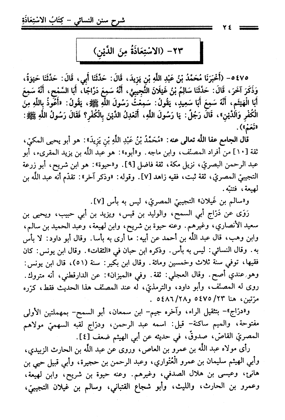 5475 - (أَخْبَرَنَا مُحَمَّدُ بْنُ عَبْدِ اللَّهِ بْنِ يَزِيدَ، قَالَ: حَدَّثَنَا أَبِي، قَالَ: حَدَّثَنَا حَيْوَةُ، وَذَكَرَ آخَرَ، قَالَ: حَدَّثَنَا سَالِمُ بْنُ غَيْلاَنَ التُّجِيبِيُّ، أَنَّهُ سَمِعَ دَرَّاجًا، أَبَا السَّمْحِ، أَنَّهُ سَمِعَ أَبَا الْهَيْثَمِ، أَنَّهُ سَمِعَ أَبَا سَعِيدٍ، يَقُولُ: سَمِعْتُ رَسُولَ اللَّهِ -صلى الله عليه وسلم-، يَقُولُ: "أَعُوذُ بِاللَّهِ مِنَ الْكُفْرِ وَالدَّيْنِ"، قَالَ رَجُلٌ: يَا رَسُولَ اللَّهِ، أَتَعْدِلُ الدَّيْنَ بِالْكُفْرِ؟ فَقَالَ رَسُولُ اللَّهِ -صلى الله عليه وسلم-: "نَعَمْ").