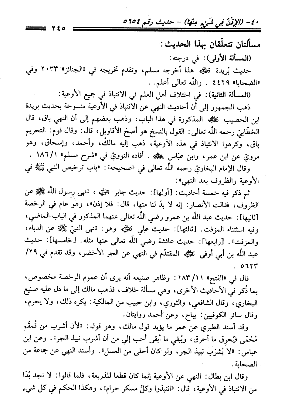 ثم ذكر فيه خمسة أحاديث: [أولها]: حديث جابر -رضي الله عنه-، "نهى رسول الله -صلى الله عليه وسلم- عن الظروف، فقالت الأنصار: إنه لابدّ لنا منها، قَالَ: فلا إذن"، وهو عام فِي الرخصة [ثانيها]: حديث عبد الله بن عمرو رضي الله تعالى عنهما المذكور فِي الباب الماضي، وفيه اسثتناء المزفت. [ثالثها]: حديث عليّ -رضي الله عنه- وهو: "نهى النبيّ -صلى الله عليه وسلم- عن الدباء، والمزفت". [رابعها]: حديث عائشة رضي الله تعالى عنها مثله. [خامسها]: حديث عبد الله بن أبي أوفى -رضي الله عنه- المتقدم فِي النهي عن الجر الأخضر، وَقَدْ تقدّم فِي 29/ 5623.
