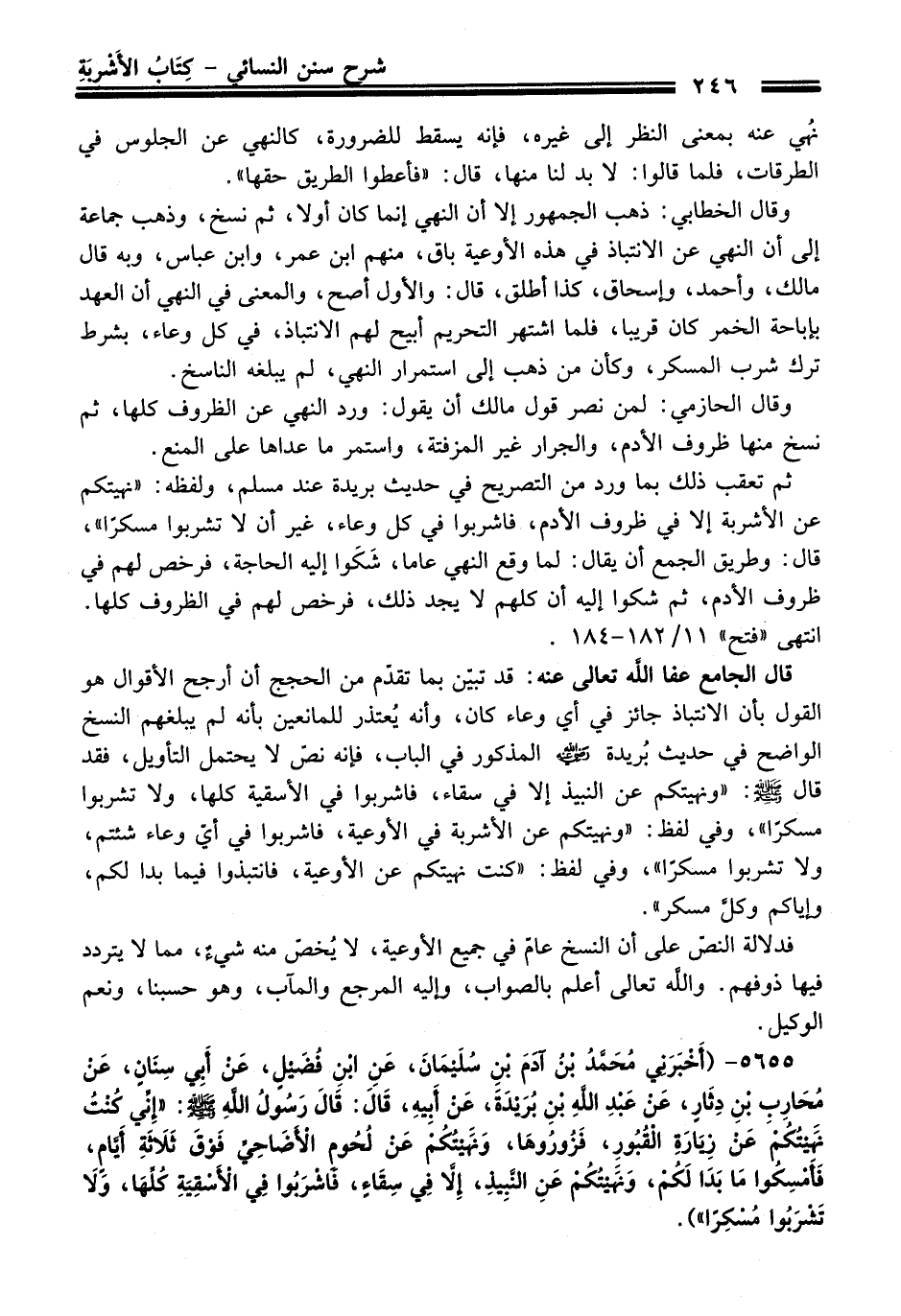 5655 - (أَخْبَرَنِي مُحَمَّدُ بْنُ آدَمَ بْنِ سُلَيْمَانَ، عَنِ ابْنِ فُضَيْلٍ، عَنْ أَبِي سِنَانٍ، عَنْ مُحَارِبِ بْنِ دِثَارٍ، عَنْ عَبْدِ اللَّهِ بْنِ بُرَيْدَةَ، عَنْ أَبِيهِ، قَالَ: قَالَ رَسُولُ اللَّهِ -صلى الله عليه وسلم-: "إِنِّي كُنْتُ نَهَيْتُكُمْ عَنْ زِيَارَةِ الْقُبُورِ، فَزُورُوهَا، وَنَهَيْتُكُمْ عَنْ لُحُومِ الأَضَاحِي فَوْقَ ثَلاَثَةِ أَيَّامٍ، فَأَمْسِكُوا مَا بَدَا لَكُمْ، وَنَهَيْتُكُمْ عَنِ النَّبِيذِ، إِلاَّ فِي سِقَاءٍ، فَاشْرَبُوا فِي الأَسْقِيَةِ كُلِّهَا، وَلاَ تَشْرَبُوا مُسْكِرًا").