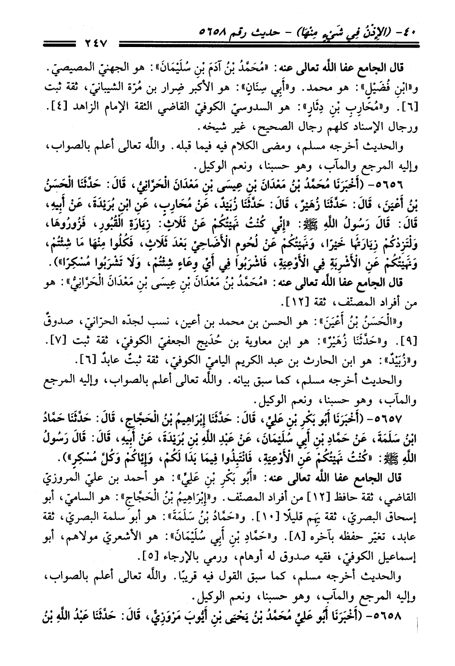 قَالَ الجامع عفا الله تعالى عنه: "أَبُو بَكْرِ بْنُ عَلِيٍّ": هو أحمد بن عليّ المروزيّ القاضي، ثقة حافظ [12]، منْ أفراد المصنّف. و"إِبْرَاهِيمُ بْنُ الْحَجَّاجِ": هو الساميّ، أبو إسحاق البصريّ، ثقة يَهِم قليلاً [10]. و"حَمَّادُ بْنُ سَلَمَةَ": هو أبو سلمة البصريّ، ثقة عابد، تغيّر حفظه بآخره [8]. و"حَمَّادِ بْنِ أَبِي سُلَيْمَانَ": هو الأشعريّ مولاهم، أبو إسماعيل الكوفيّ، فقيه صدوقٌ له أوهام، ورمي بالإرجاء [5].