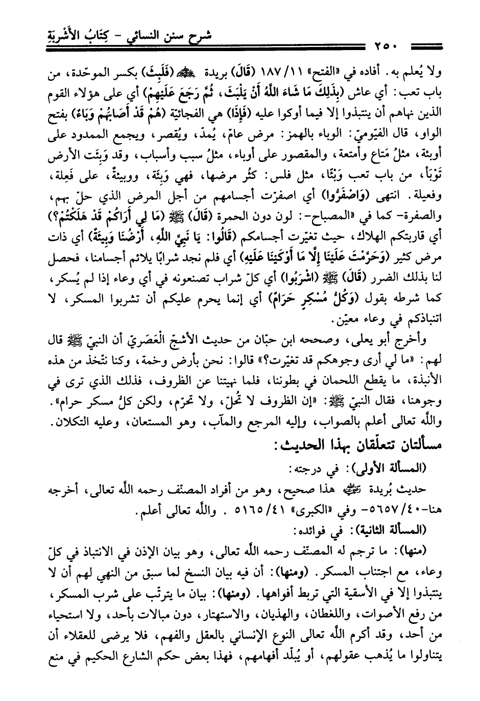ولا يُعلم به. أفاده فِي "الفتح" 11/ 187 (قَالَ) بريدة -رضي الله عنه- (فَلَبثَ) بكسر الموحّدة، منْ باب تعب: أي عاش (بِذَلِكَ مَا شَاءَ اللهُ أَنْ يَلْبَثَ، ثُمْ رَجَعَ عَلَيْهَمْ) أي عَلَى هؤلاء القوم الذين نهاهم أن ينتبذوا إلا فيما أوكوا عليه (فَإِذَا) هي الفجائيّة (هُمْ قَدْ أَصَابَهُمْ وَبَاءٌ) بفتح الواو، قَالَ الفيّوميّ: الوباء بالهمز: مرض عامّ، يُمدّ، ويُقصر، ويجمع الممدود عَلَى أوبئة، مثلُ مَتاع وأمتعة، والمقصور عَلَى أوباء، مثلُ سبب وأسباب، وَقَدْ وَبِئَت الأرض تَوْبَأ، منْ باب تعب وَبْئًا، مثل فلس: كثُر مرضها، فهي وَبِئَة، ووبيئةٌ، عَلَى فَعِلة، وفعيلة. انتهى (وَاصْفَرُّوا) أي اصفرّت أجسامهم منْ أجل المرض الذي حلّ بهم، والصفرة -كما فِي "المصباح-: لون دون الحمرة (قَالَ) -صلى الله عليه وسلم- (مَا لِي أَرَاكُمْ قَدْ هَلَكْتُمْ؟) أي قاربتكم الهلاك، حيث تغيّرت أجسامكم (قَالُوا: يَا نَبِيَّ اللَّهِ، أَرْضُنَا وَبِيئَةٌ) أي ذات مرض كثير (وَحَرَّمْتَ عَلَيْنَا إِلاَّ مَا أَوْكَيْنَا عَلَيْهِ) أي فلم نجد شرابَا يلائم أجسامنا، فحصل لنا بذلك الضرر (قَالَ) -صلى الله عليه وسلم- (اشْرَبُوا) أي كلّ شراب تصنعونه فِي أي وعاء إذا لم يُسكر، كما شرطه بقول (وَكُلُّ مُسْكِرٍ حَرَامٌ) أي إنما يحرم عليكم أن تشربوا المسكر، لا اتنباذكم فِي وعاء معّين.