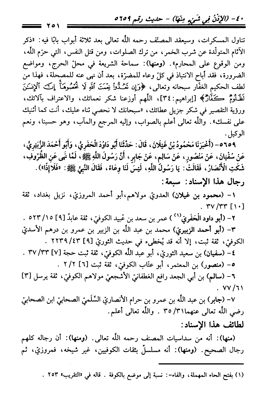 5659 - (أَخْبَرَنَا مَحْمُودُ بْنُ غَيْلاَنَ، قَالَ: حَدَّثَنَا أَبُو دَاوُدَ الْحَفَرِيُّ، وَأَبُو أَحْمَدَ الزُّبَيْرِيُّ، عَنْ سُفْيَانَ، عَنْ مَنْصُورٍ، عَنْ سَالِمٍ، عَنْ جَابِرٍ، أَنَّ رَسُولَ اللَّهِ -صلى الله عليه وسلم-، لَمَّا نَهَى عَنِ الظُّرُوفِ، شَكَتِ الأَنْصَارُ، فَقَالَتْ: يَا رَسُولَ اللَّهِ، لَيْسَ لَنَا وِعَاءٌ، فَقَالَ النَّبِيُّ -صلى الله عليه وسلم-: "فَلاَ إِذًا").