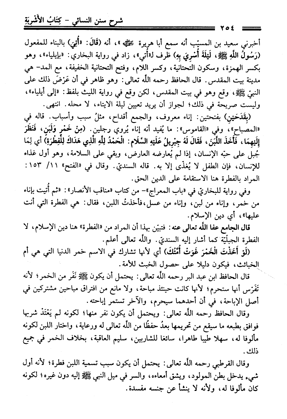 وفي رواية للبخاريّ فِي "باب المعراج"- منْ كتاب "مناقب الأنصار": "ثم أُتيت بإناء منْ خمر، وإناء منْ لبن، وإناء منْ عسل، فأخذتُ اللبن، فَقَالَ: هي الفطرة التي أنت عليها"، أي دين الإسلام.